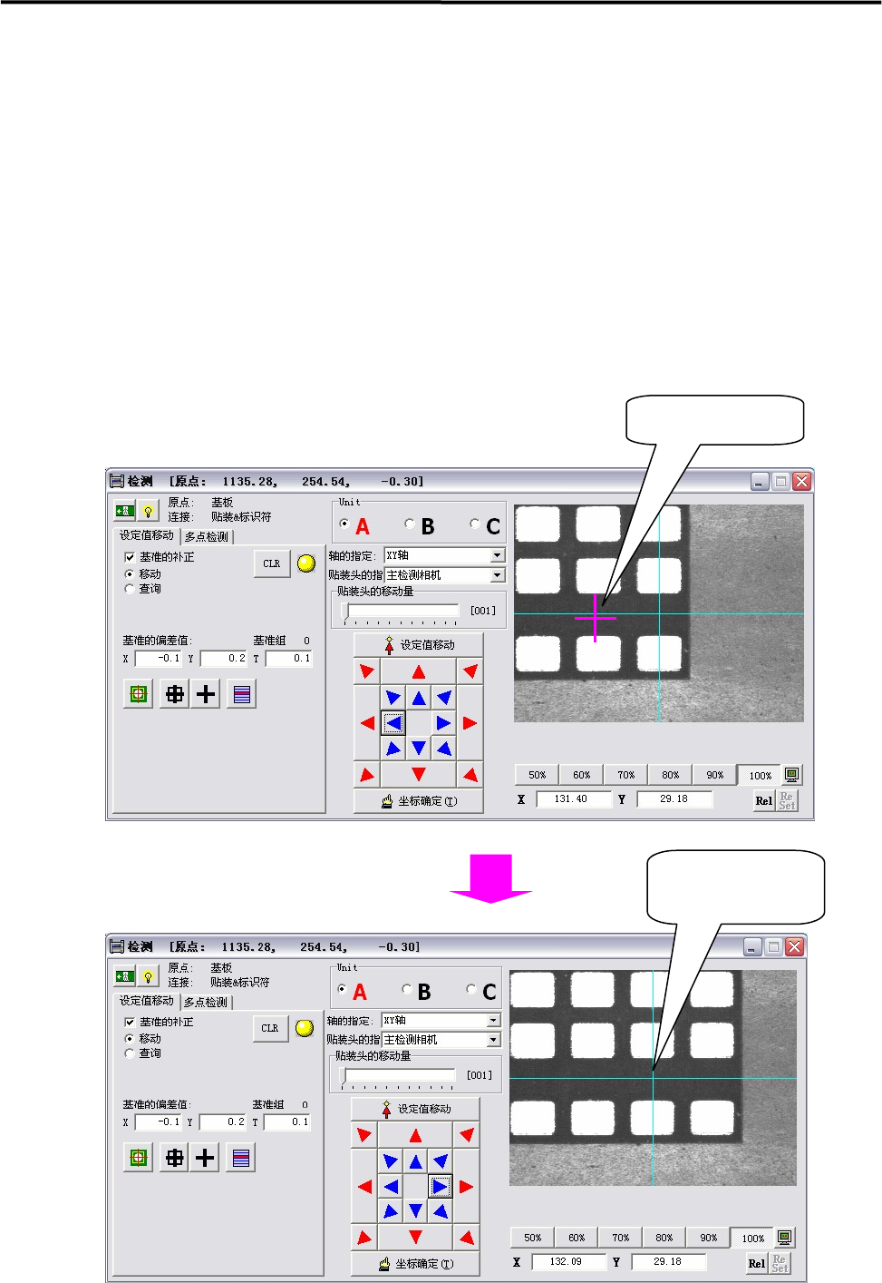 (7) 观察实际检测相机的移动和信息显示窗口的显示的同时,将检测相机搬到检测对象的坐标附