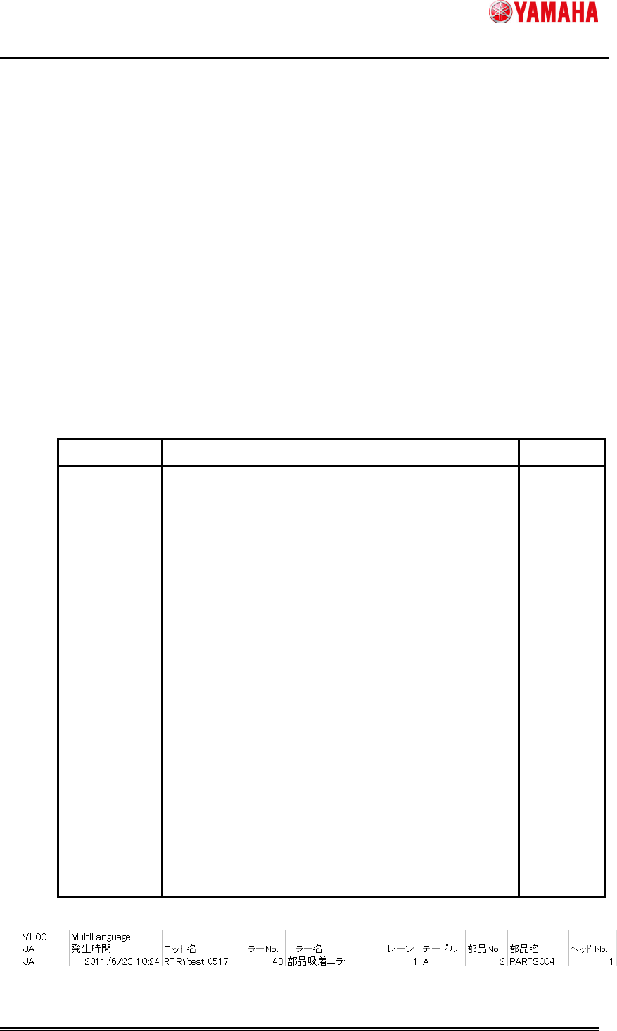 ヤマハ発動機株式会社 IM 事業部 マウンター技術部 ソフト開発グループ MDOC-SOFT50141 6/6 (全項サンプル 続き) 4.5. 4.5. 4.5. 4.5. リト ライログ リトラ イログ リトラ イログ リトラ イログ出力失 敗 出力失敗 出力失敗 出力失敗 につ いて につい て につい て につい て リト ライ情 報をロ グフ ァ イル に 出力 失 敗し た 場合、 エ ラー…