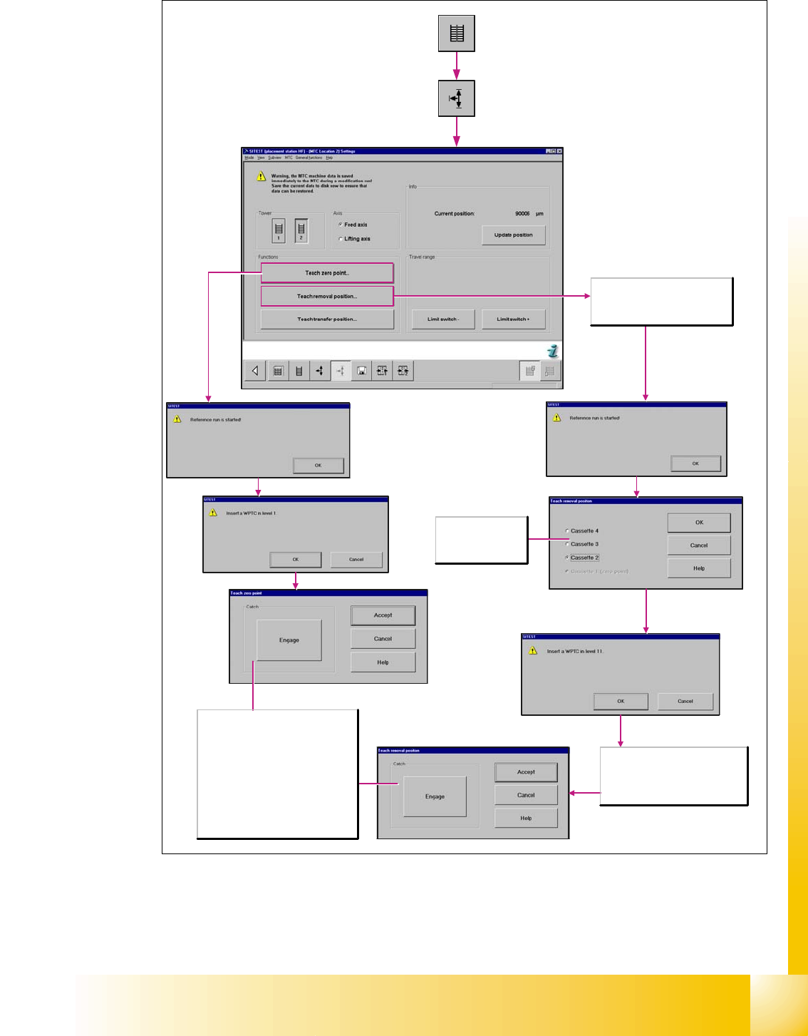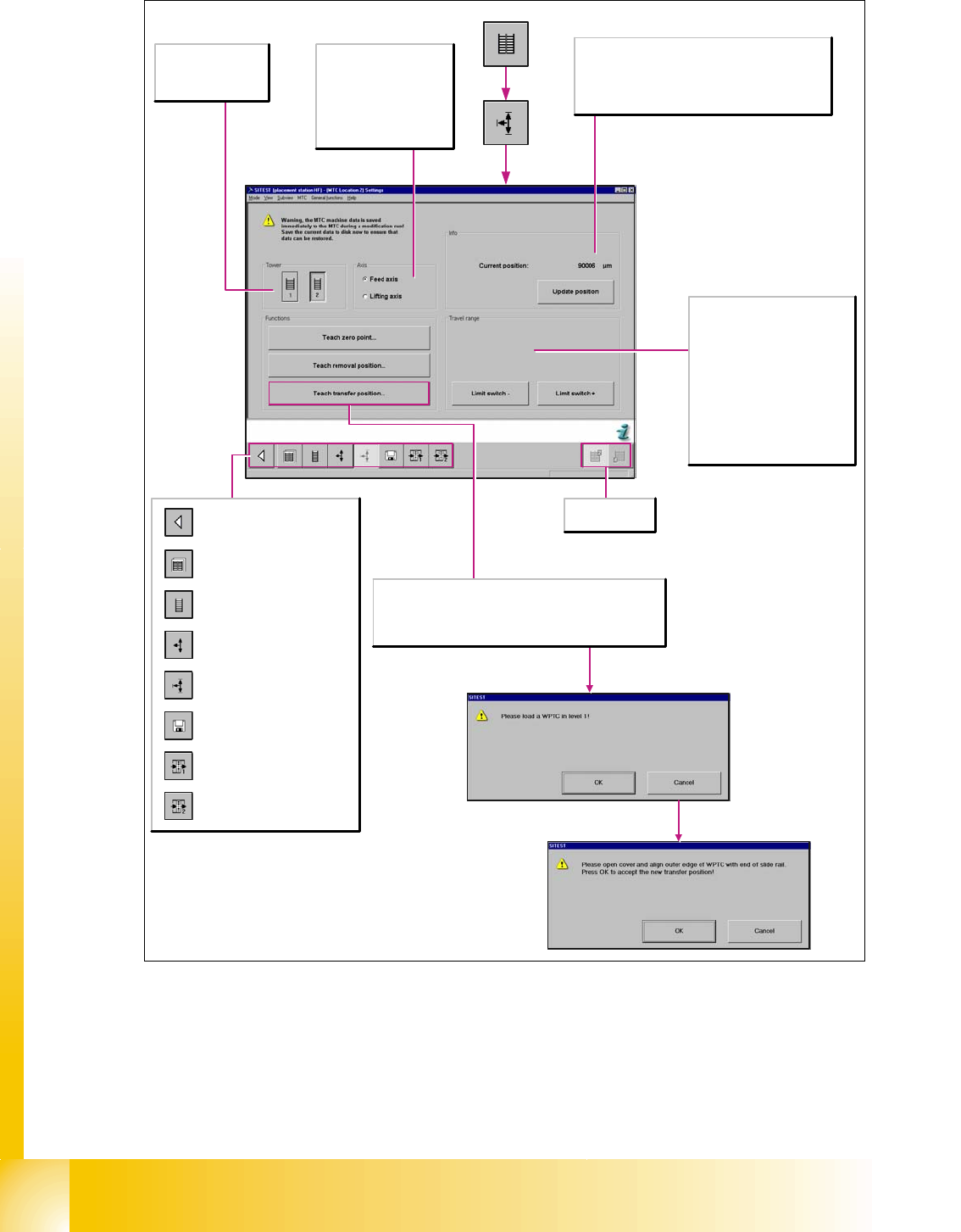 1 - 45 S tudent Guide SIPLACE HF/HF3 Edition 09/2005 1 1 MTC 2 45 Fig. 1 1.3 - 1 1 Overview "Calibration feed axe s 2/2" Catch Engage The catch is engaged in the waffle pack tray car rier. Thi s allow s a waffl…