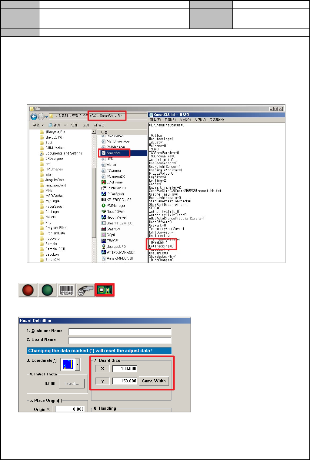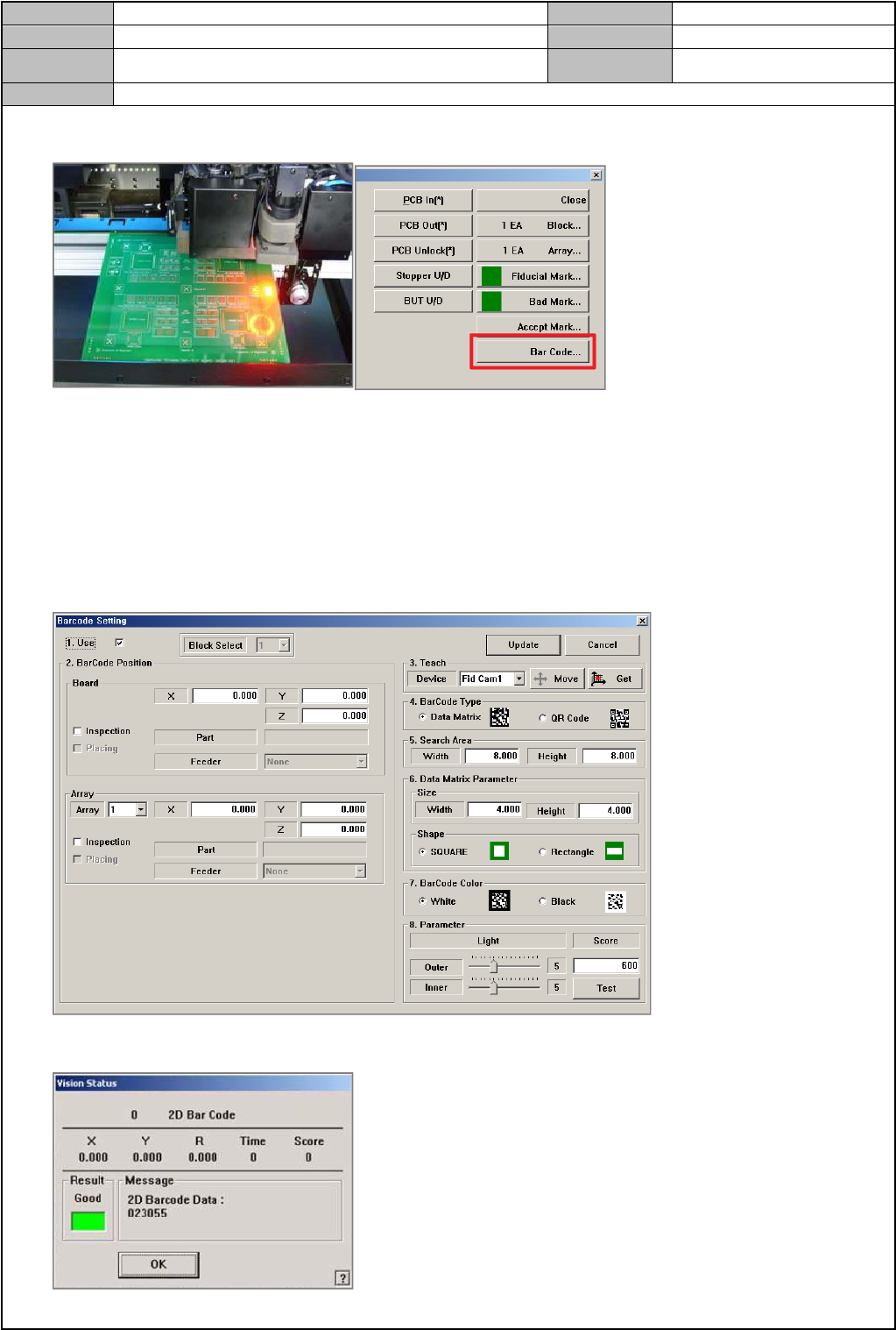 Model DECAN Series Company SAMSUNG TECHWIN Module 3.8 IT , L TS V ersion 01 Tit le 设定 2D BAR CODE Page 3-8-3 Note 4. 加载 PCB ,从 Wo rk S ta ti on 夹钳后,选择 [Bar Code] 菜单 5. Barcode 设定 Use: 勾选 将基准相机对准到 2D 条码后, 按下 [Get] 设…