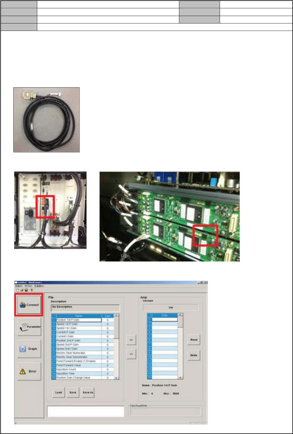 Model DECAN Series Company SAMSUNG TECHWIN Module 3.7 P ARAMETER V ersion 01 Tit le Motor Driver Parameter download(Z) Page 3-7-9 Note [MOTOR DRIVER P ARAMETER DOWNLOAD(Z)] 1. 执行 WindComm+ 程序 2. 准备 Parameter Cable(Z 轴 ) …