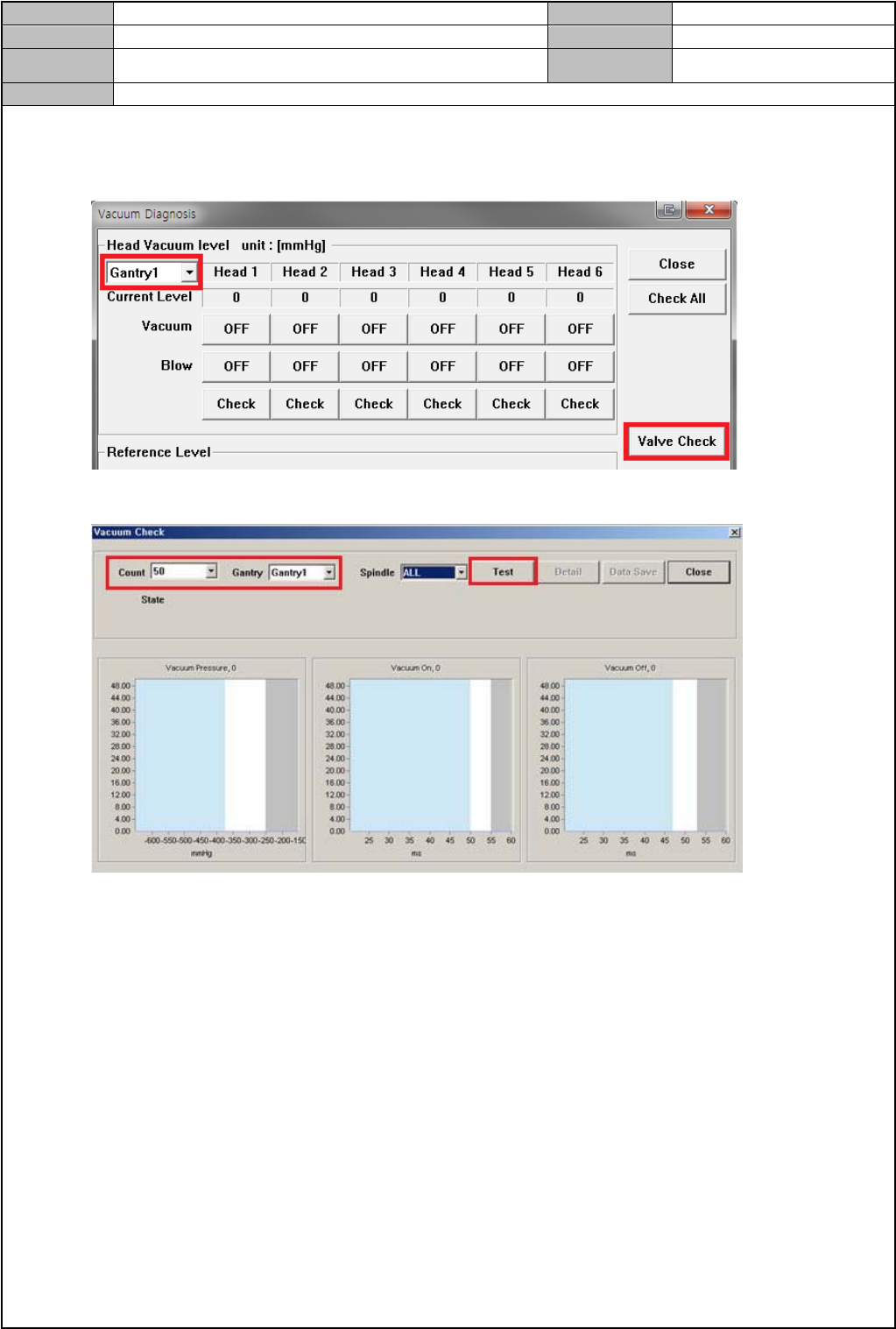 Model DECAN Series Company SAMSUNG TECHWIN Module 3.1 1 HEAD V ersion 01 Tit le 设定 HEAD BLOW 及 V ACUU M(L2) Page 3-1 1-10 Note 进行 V alve Check 1. 选择 Gantry1 后,点击 <V alve Check> 2. 在 <Count> 输入 50 , <Gant…