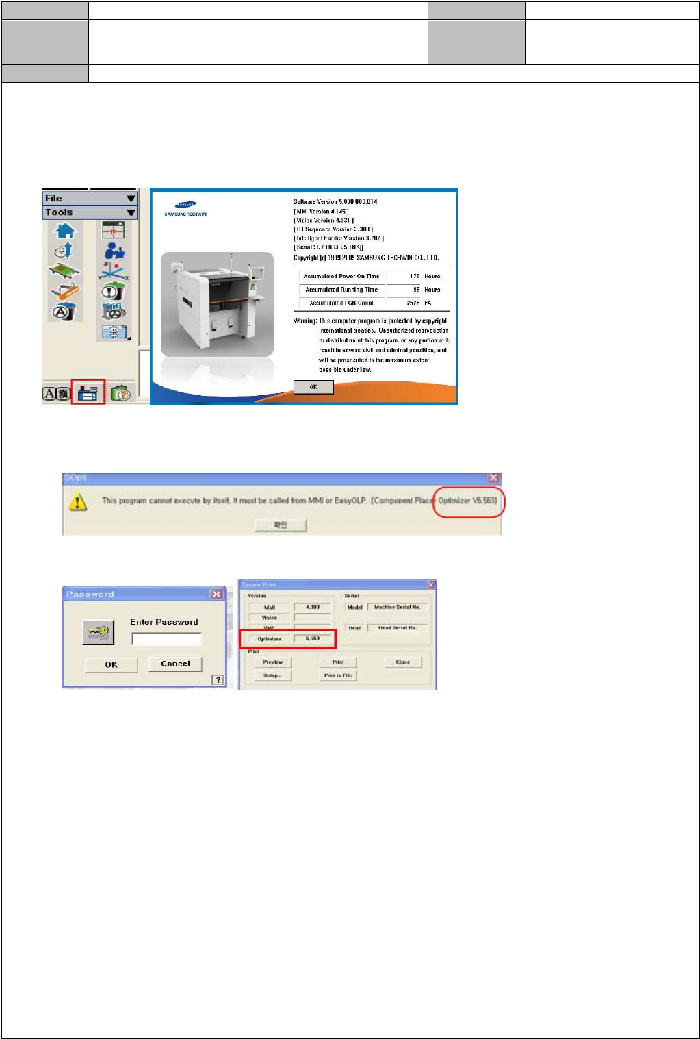 Model DECAN Series Company SAMSUNG TECHWIN Module 3.12 MMI V ersion 01 Tit le 确认 MMI 版本 Page 3-12-23 Note [ 确认 MMI 版本 ] 1. 点击 MMI 左下方的 C/M 形状的图标后,确认版 本 2. 可通过两个方法确认 Optimizer 版本 执行 SMARTSM\BIN\SOpti.exe 后,确认 MMI =>…