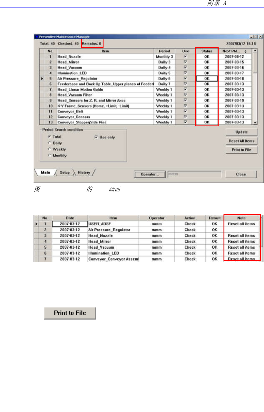 Samsung Component Pla cer SM41 1 Administrator ’ s Guide A-8. History A.4.6. 所有的查项目变更为检查完成 ( “ OK ” ) 状态 所有的检查项目可以一 次性改变为已完成检查的状态。方 法如下。 点击 <Reset All Items> 按钮 出现 PMMan ager 对话框时点击 < 是 (Y)> 按钮。 A-8