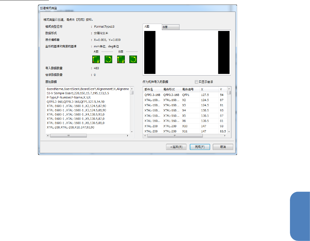 第 4 章 操作 篇 4- 5. 机型数据 的创建和编辑 65 4 10. 完成确认 画面 在「格式类型 名称 」、「 数据 形式」、「原点偏移 量」、「坐标的基准 和角度的 基准 」中显示所 指定 的 内容。 在「导入数据 数量 」中显示导入的数 据数量。 在「错误数据数量」中 显示从字符串变换成 数值(坐标及角度) 时类型转换失败的 数据数。 在预览 画面 中 显示 A 面和 B 面的 CAD 数据 。 未能 导入数据时,预览时显示…