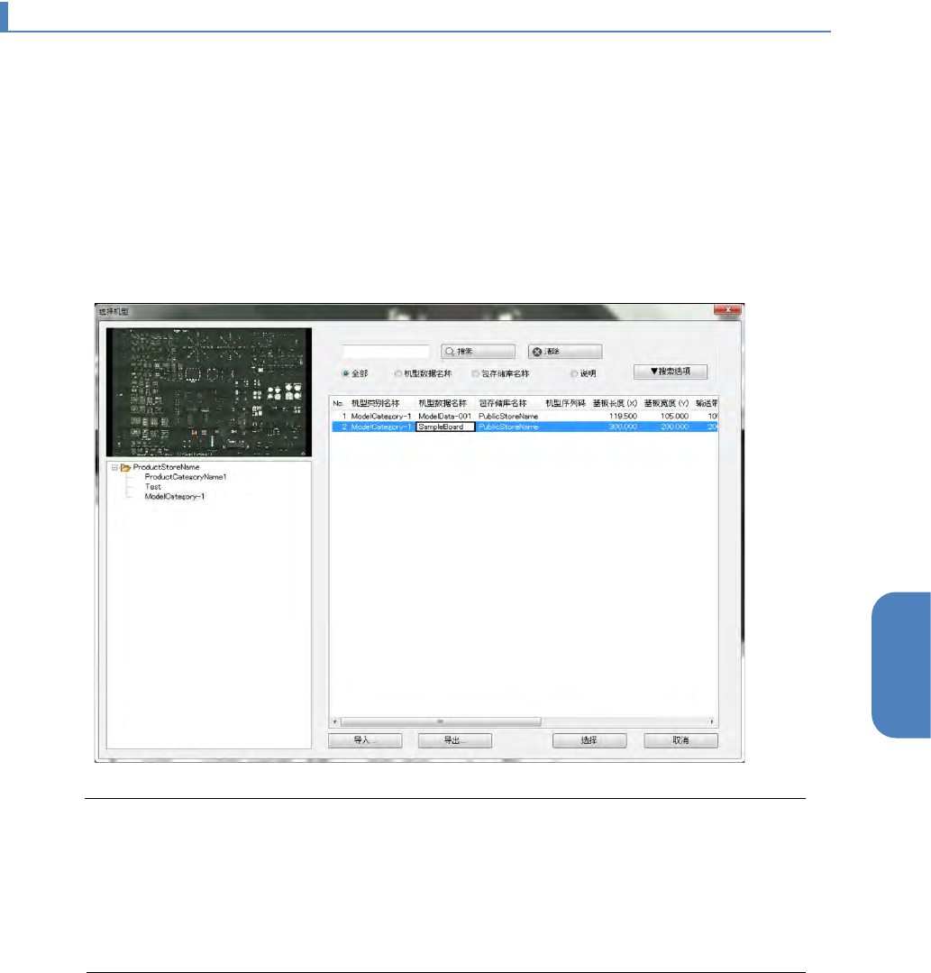 第 4 章 操作 篇 4- 5. 机型数据 的创建和编辑 69 4 4-5- 7. 选择 机型 通过新建数据创建的数 据可以在[编辑机型 数据]画面的菜单中 ,通过[文件] - [选择机型]设定详 细基板信息。 1 在[编辑机型数据]画面中点击[选择机型]。或者,选择菜单中的[文件] - [选 择机型]。 2 在画面左侧选择机型存储的机型类别。 3 从画面右侧的机型数据列表中选择目标机型数据,点击[选择]。 Tips • 用鼠标右键点击…