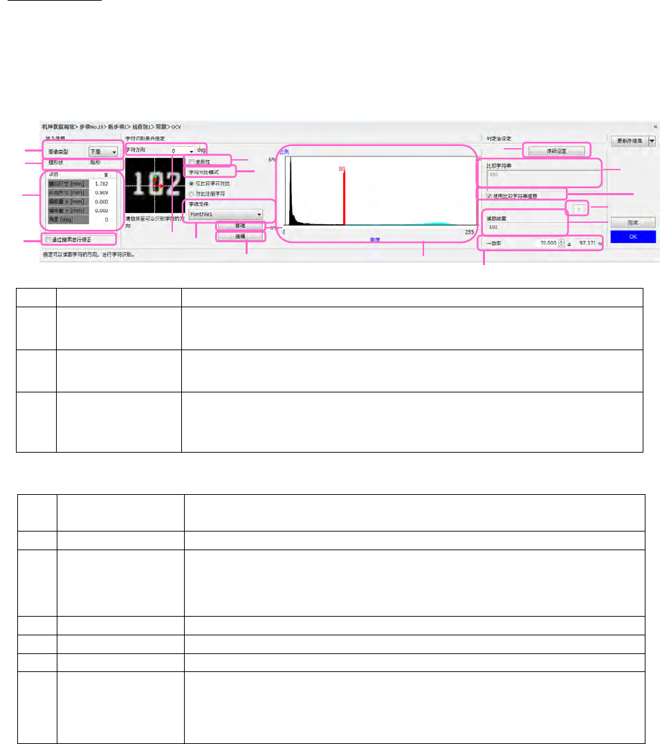 第 4 章 操作 篇 4- 5. 机型数据 的创建和编辑 115 4 判定值设定 l 比较字符串 此输入框用于输入判定 用的正确字符串。 勾选[ 使用 比较字符串信息]时,此 项无效。 m [ ↑ ]按钮 点击此项后, 会将 「 读取结果 」中显示的字符串 作为 「比较字符串」 进行 设定 勾选[使用比较字符串 信息]时,此项无效 。 n 读取结果 显示检查进程的执行 结果 (对比的字 符串 )。 如果无法识别字符串 ,则显示 字符串「…
