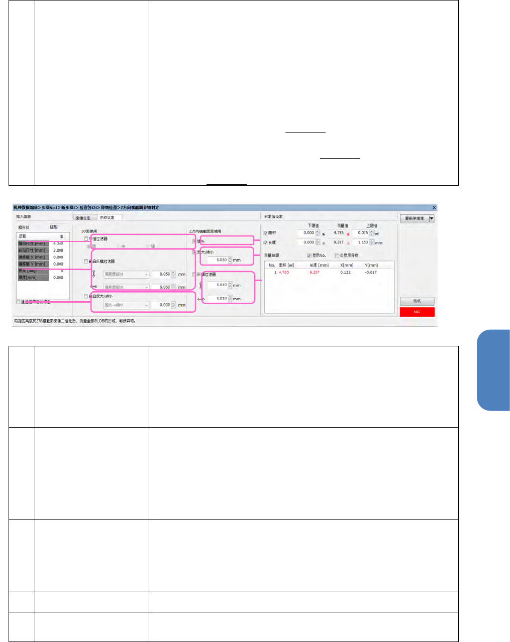 第 4 章 操作 篇 4- 5. 机型数据 的创建和编辑 134 (n) 纵横过滤器 纵横过滤器勾选 ON ,则针对 Z 方向横截面的 2 值化图像,删除 指 定尺寸 [mm] 以下的区域。 可以分别对纵、横实施 过滤处理。 4-5- 14. i- 3D 测定( RV -2 专用) (1) 什么是 i- 3D i- 3D 是使用高度图像对焊 锡等的体积或高度 进行测量、判定的工 具。 通过将其编入处理库编 辑中,可组合更高精 度的程序。…