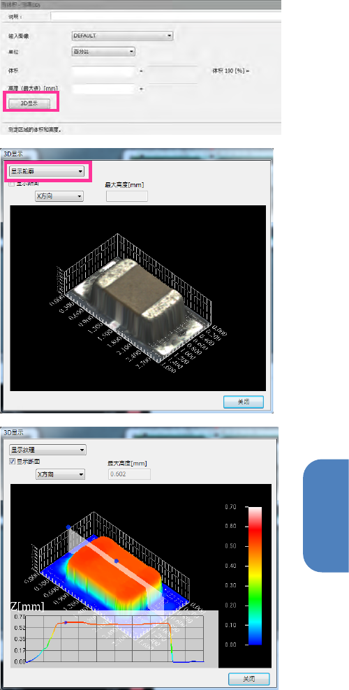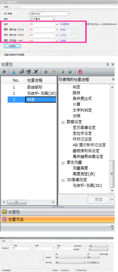 第 4 章 操作 篇 4- 5. 机型数据 的创建和编辑 156 ( 6) 判定的设定 1 体积,高度(最小值) ,高度(最大值 ), 输 入在高度(平 均 值 ) 的每个 值 。 (数字本地 内存) 2 追加 判定的检查过程 3 输入占所 指定区域体 积的条件。 4 追加 判定检查过程 。 5 将先实施确认的元件高度(最大值)的数值 作为参考,输入 条件式。 6 对能否正确 识别实施测试 。 Memo OK 时,设定结束。 NG 时请…