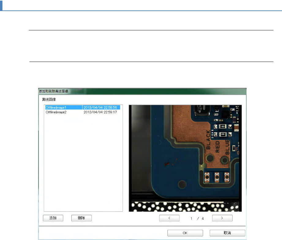 第 4 章 操作 篇 4- 5. 机型数据 的创建和编辑 164 4-5- 20. 离线图像的追加和删 除 可追加和删除含有机型 数据的离线图像。 Tips • 离线图像是指可检查每 块 基板 图像的总称。可在 机型数据 中保存多个离线图 像,即使 在离线环境下也可进行 数据编辑。 离线图像的追加 选择菜单中的[工具 (&T ) ] - [添加和删除离线图像 ],显示含有机型 数据的离线图像。 将创建离线图像的基板 放在…