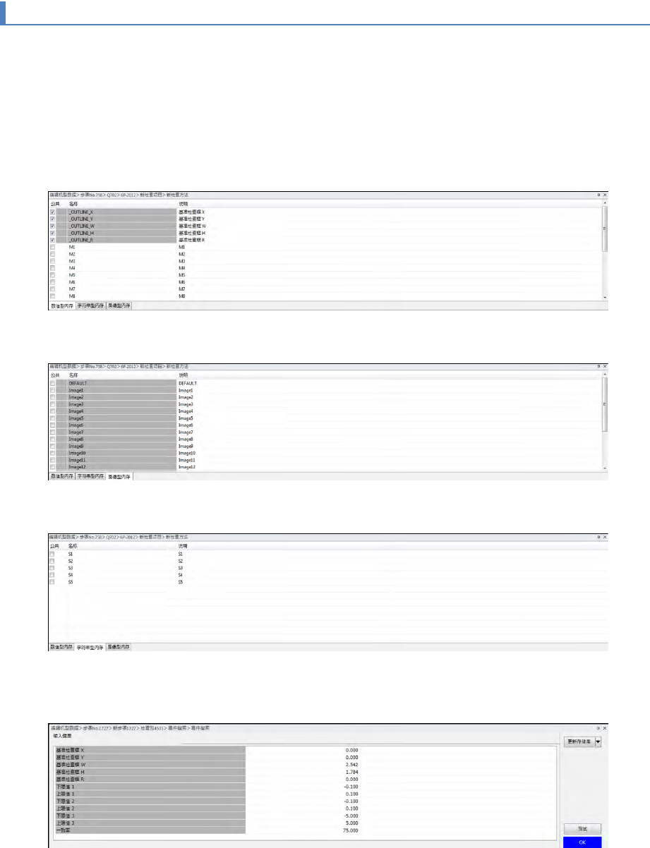 第 4 章 操作 篇 4- 6. 进程模式 182 4-6- 8. 本地内存 在检查方法树状图中 选择 根节点后, 将显示本地内存定 义画面。 本地内存定义 画面 中有 3 个选项卡,在不同 画面对检查进程中使 用的本地内存进 行公 开设 定和 说明文的 编辑。公开本地内存后 ,将在检查包树状图 的检查方法画面中显 示,初始值变为可 输入。 数值 型本地内存 可编辑数值型本地内存 。 图 像型内存 可编辑图像型变量。 字符串…
