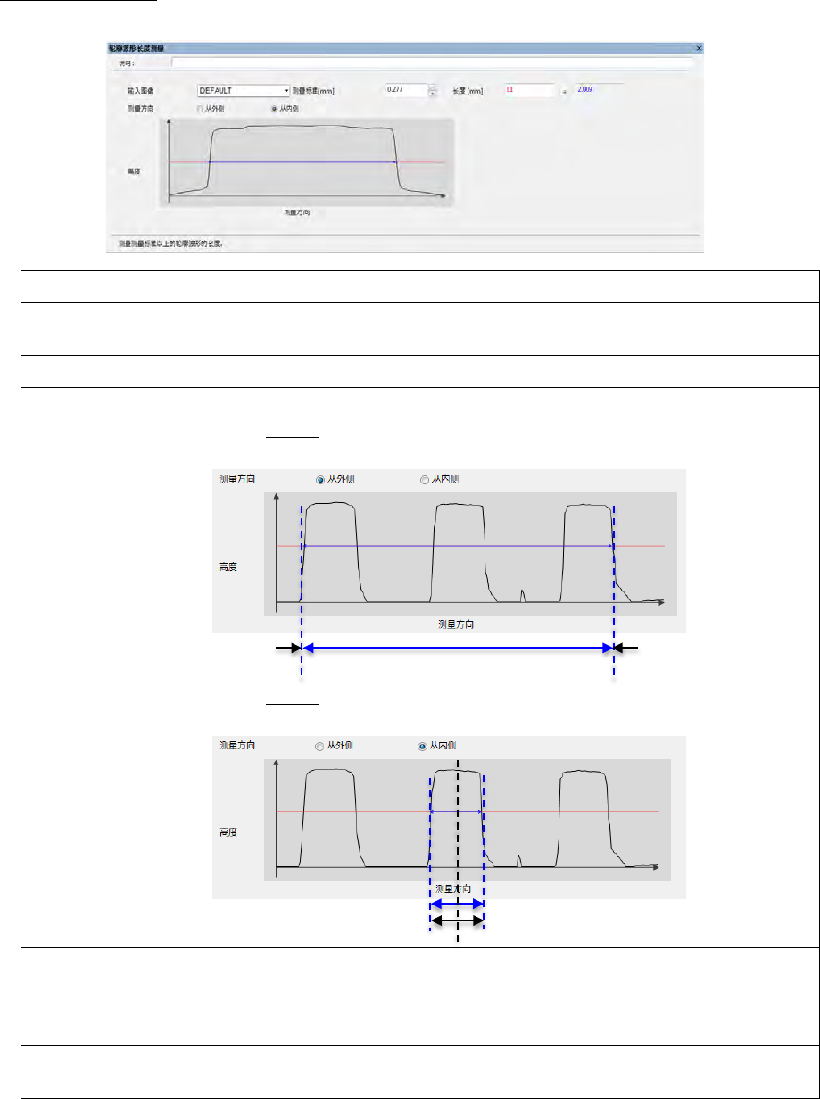第 4 章 操作 篇 4- 6. 进程模式 188 轮廓波形长 度测量 对轮廓波形超过测量标 准的长度进行测量。 说明 可以输入说明。输入的 说明也显示在过程列 表中。 输入图像 指定输入源的图像型 本地内存 。 ※可以指定为输入图像 的只有轮廓 数据 测量标准 [mm] 设定轮廓波形的测量 高度 。 测量方向 设定测量长度 时的 测量方向。 选择了从外侧时,从轮 廓 波形 的外侧向测量标准以上的 位置进行搜索,并将 该距离作为测量结果…