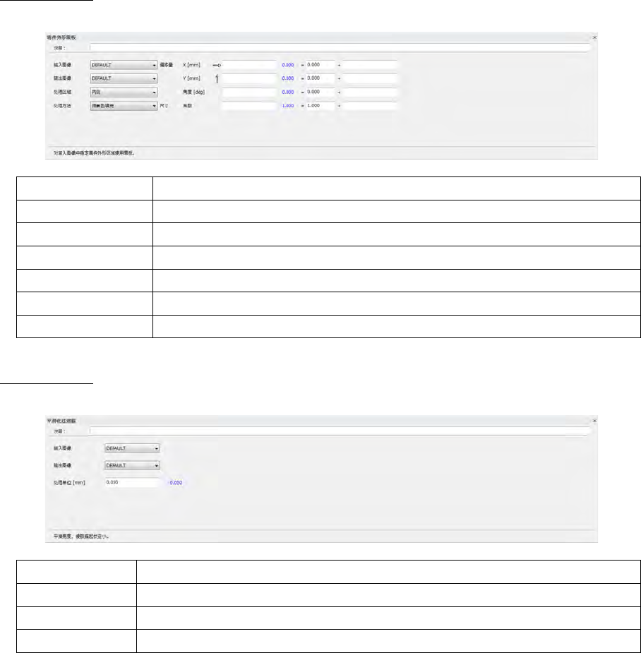 第 4 章 操作 篇 4- 6. 进程模式 193 4 微过滤波 将指定的亮度范围调 整到 256 阶段。 指定的高度范围和色调 到最小到最大值的阶 段。 说明 可输入注释。 输入图像 指定输入源的图像型本 地内存。 处理方法 从 [ 亮度图像 ] · [ 高度图像 ] 选择。 输出图像 指定输出目标的图像型 本地内存。 亮度范围 指定过滤器亮度 ( 高度 ) 的下限值,上限值 。可 输 入数 值或从本地内存中 指 定。 将范围以外的亮…