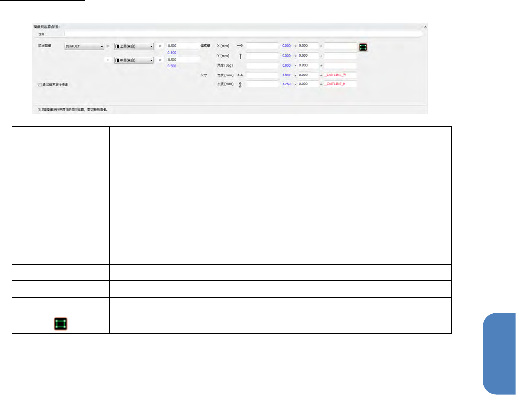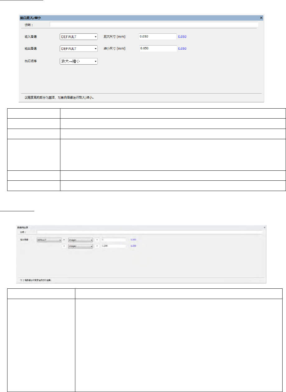 第 4 章 操作 篇 4- 6. 进程模式 196 黑白放大 / 缩小 对黑白图像,按照标准 放大 / 缩小高亮度部分。 说明 可输入备注说明。 输入图像 指定输入源的图像型 本地内存 。 输出图像 指定输出目标的图像型 本地内存。 执行顺序 指定放大和缩小的执行 顺序 ・ 放大→缩小:先放大 ,后缩小 ・ 缩小→放大:先缩小 ,后放大 放大尺寸 [mm] 指定放大处理的尺寸 缩小尺寸 [mm] 指定缩小处理的尺寸。 图像间运算 在 2…
