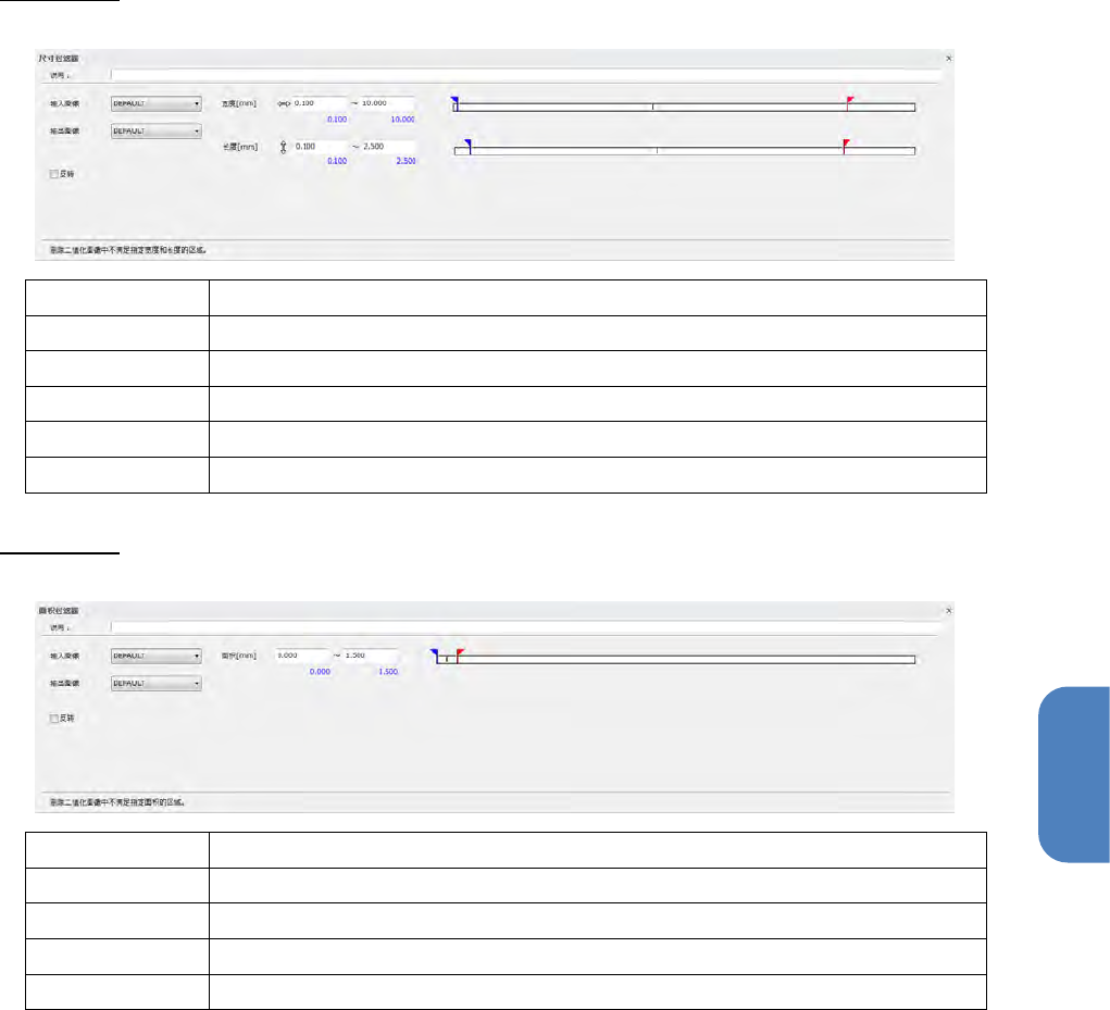 第 4 章 操作 篇 4- 6. 进程模式 218 端接过滤器 对于 2 值化图像,删除接触 到检查 框的 2 值化 区域 。 说明 输入检查进程的说明 ,并显示 。 输入图像 指定输入源的图像型本 地内存。 输出图像 指定输出目标的图像型 本地内存。 零件搜索结果设定 设定零件的偏移量。 可根据零件的偏移量, 对 同一 检查包内的 检查 框进行位置补正。 说明 输入检查进程 的注 释,使之显示。 X Y 角度 设定零件的偏移量( X …