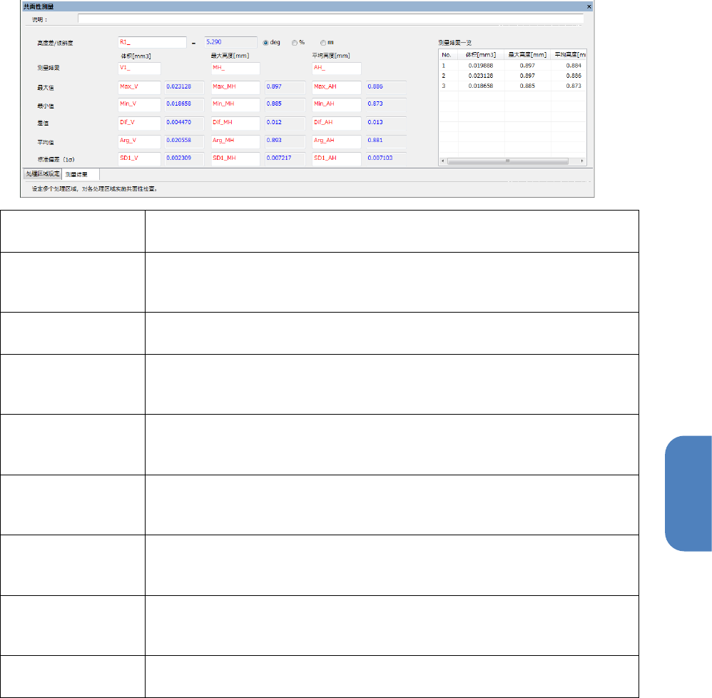 输入各测量领域的体积、最大高度、平均高度的测量结果标识符。