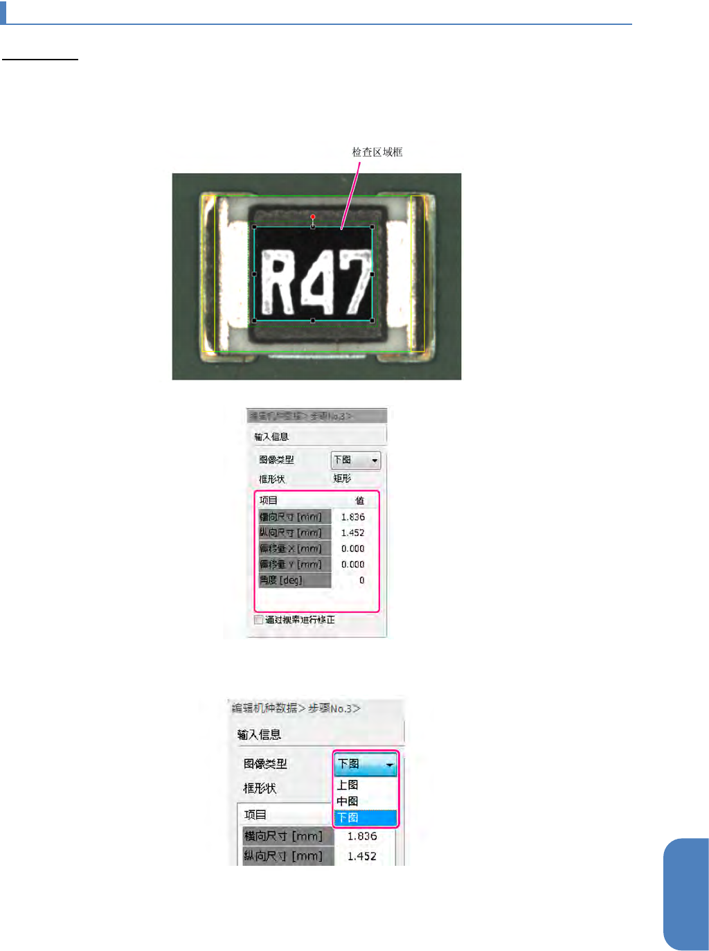 第 7 章 选配 7- 8. OCR , OCV 33 7 7-8- 3. OCR 功 能的 设定 信息的设定 1 选择扩大图像区域内所显示的黄色框,指定检查区域。 通过选择框,可改变颜 色,调整框的尺寸。 可直接输入输入信息的 数 值进 行设 定。 2 选择用于检查的图像种类。