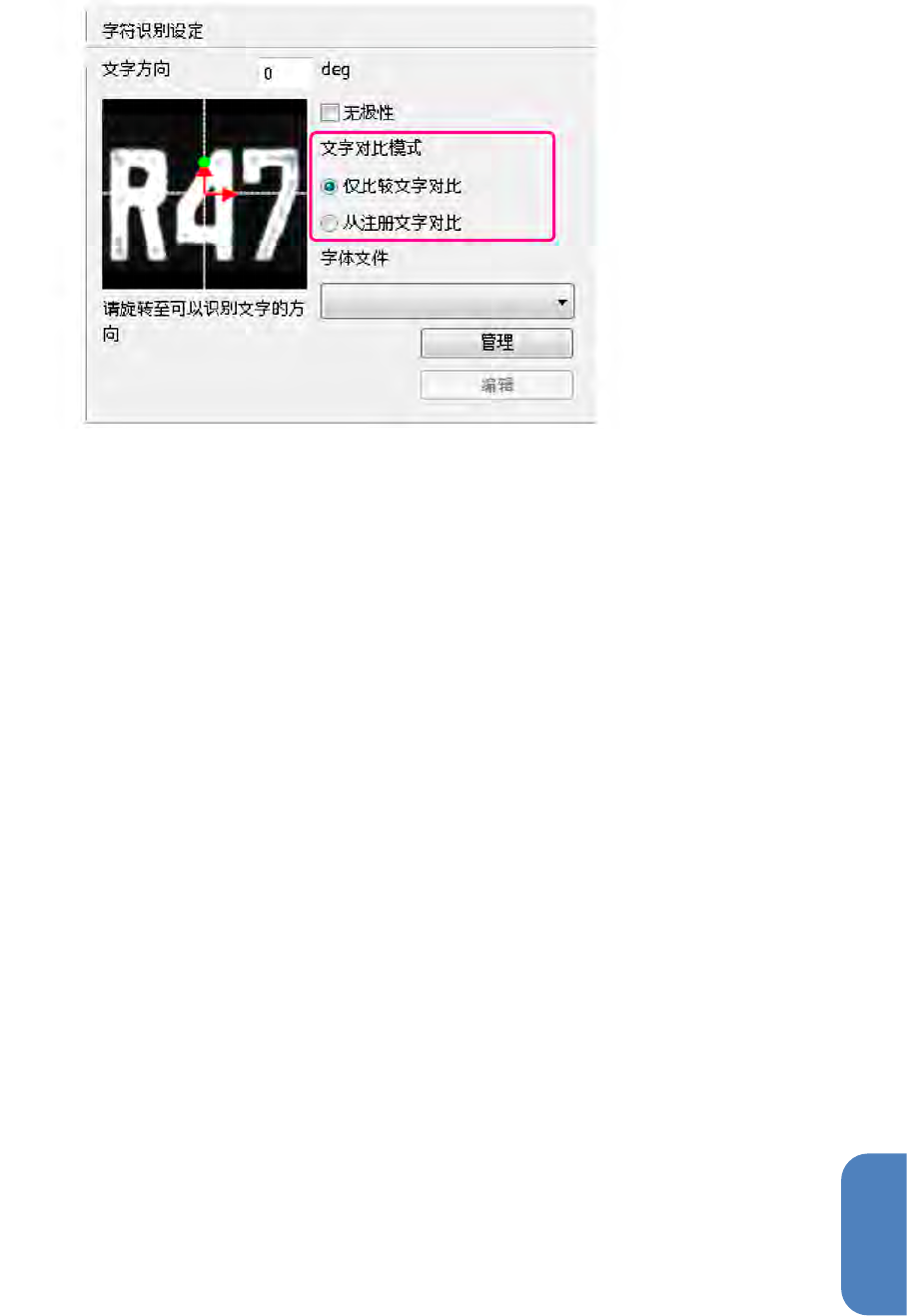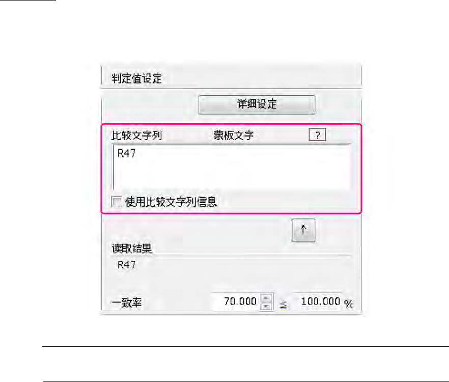 第 7 章 选配 7- 8. OCR , OCV 48 判定值设定 1 输入比较字符串。 勾选[使用比较文字列 信息]后,无法操作 。 勾选[使用比较文字列 信息]后,可将步骤 信息的比较字符串设 定为数值。 注意 • 可识别的 有半角字母数字, 记号。
