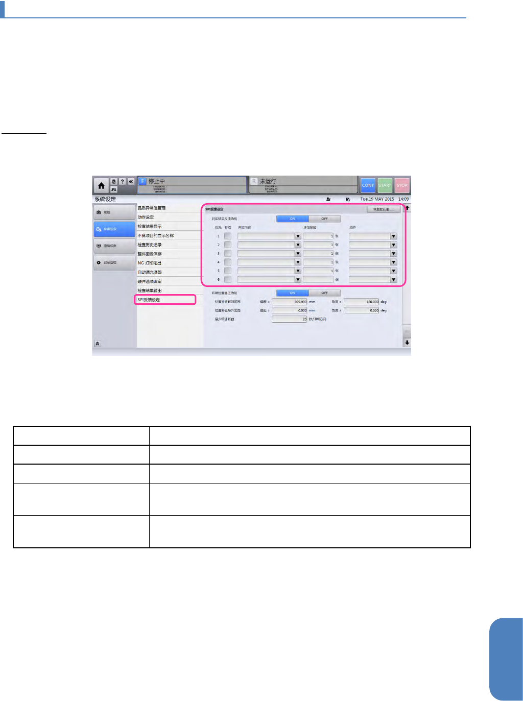 1 从顶部菜单选择[系统设定]-[检查设定],触摸子菜单的[SPI 反馈设定]。