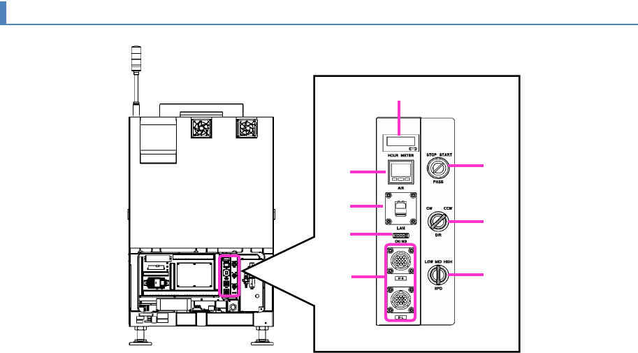 第 2 章 系统概要 2- 3. 机器的构成 19 2 (a) 紧急停止开关 (b) POWER ON 开关 / 电源指示灯 (c) POW ER OFF 开关 (d) 联锁钥匙开关 2-3- 5. 主要 开关的作用 紧 急停止开关 按下紧急停止 开关 后进入紧急停止状 态,切断装置的电 源。 顺时针旋转紧急停止 开关 ,开关部分 回到初始位置(按 下开关 的状 态)后即可解除。 紧急 停止解除 b c d a