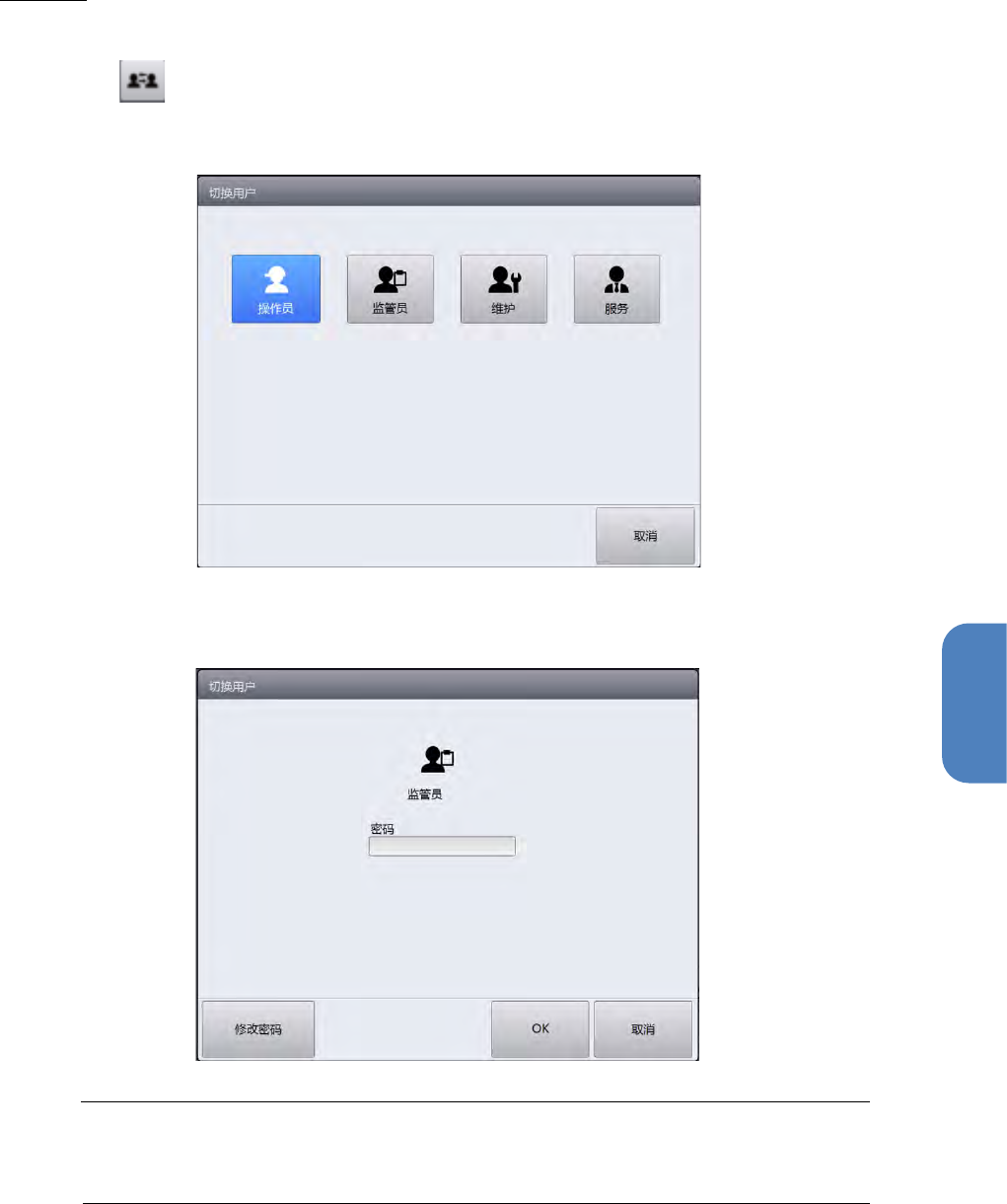 第 4 章 操作 篇 4- 2. 操作画面 构成 7 4 切换用户 可切换操作用户的权 限。 1 触摸 。 显示切换用户的弹出 画面 。 2 触摸所需用户的按钮。 如果选择[操作员] ,切 换用户并返 回主菜单。 如果触摸[操作员] 以外的按 钮,显示密 码输 入 画面 。 使用软键盘输 入密 码,触摸[ OK ] 。切 换用户完成,返回主菜 单。 Tips • 如要更改密码,触摸 画面 左下方的[ 修改密码],在密 码更改 画面 中输…