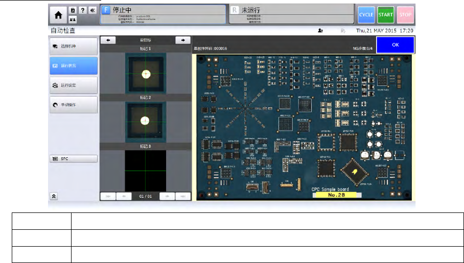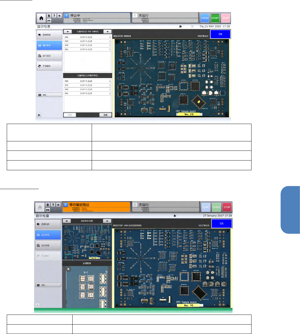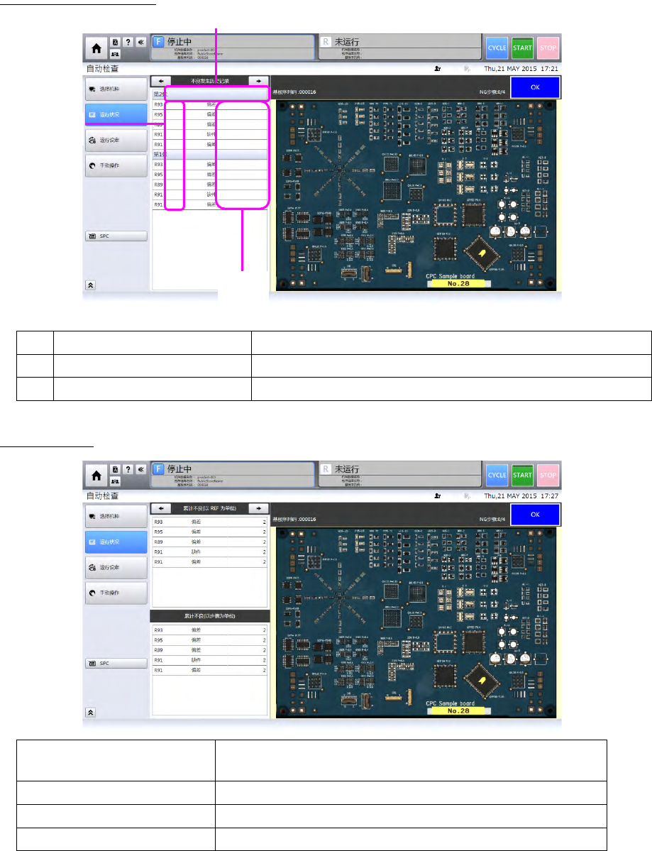 第 4 章 操作 篇 4- 3. 自动运转 的步骤 19 4 过判定显示 过量判定(以 REF 为单位) 检查完成后,按部件名 ( REF )计数显示过判定 检查包的累 计数。 过量判定(以步骤为单 位) 检查完成后,按步骤计 数显示过判定检查包 的累计数。 部件名 显示判定为过判定的部 件名。 检查包名 显示过判定的 检查 包名。 实时图像显示 上方 基板全体图像 下方 检查中的块区域