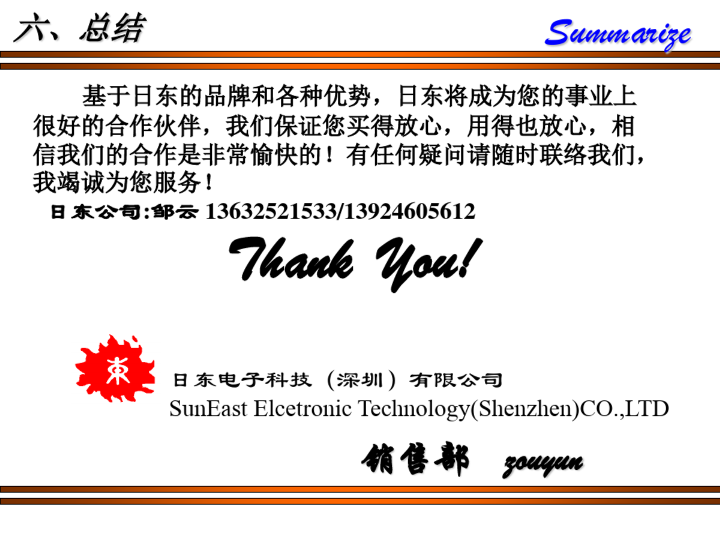 片 、 总结 基于日东的品牌和各种优势 , 日东将成为您的事业上 很好的合作伙伴 , 我们保证您买得放心 , 用得也放心 , 相 信我们的合作是非常愉快的 ! 有任何疑问请随时联络我们 , 我竭诚为您服务 ! 曰东公司 : 邹彔 13632521533 / 13924605612 曰东电子科技 ( 深圳 ) 有限公司 SmiEast Electronic Teclmology ( Sheiizlien ) CO . , LTD