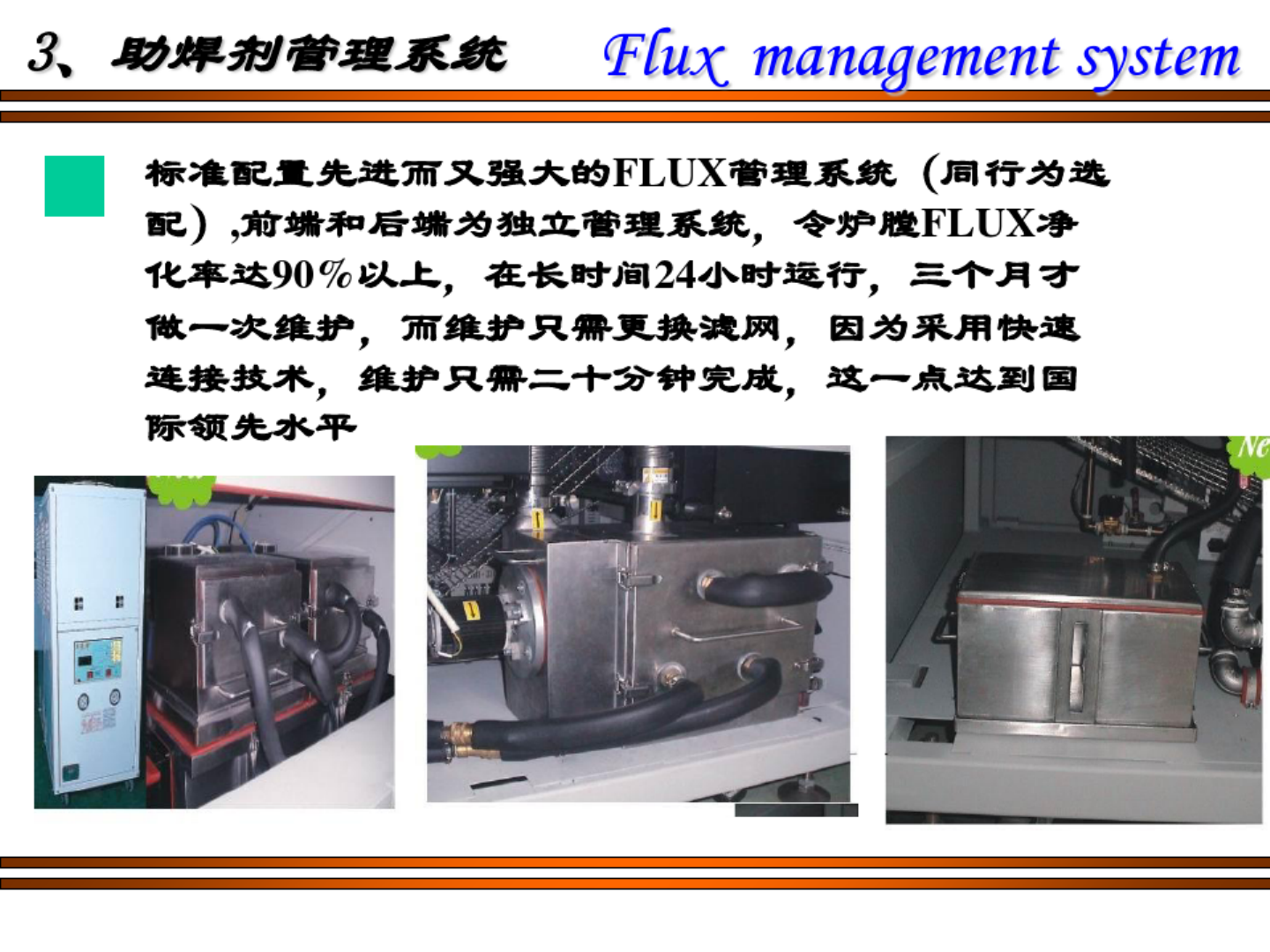 ( FCUJ ^ management system 3 、 助燁剂瞢理系筑 标凌配置先进而又强大的 FLUX 管理系统 ( 同行为选 配 ) , 前揪和后嫌为独立管理系统 , 令炉膛 FLUX 净 化丰达 90 % 以上 , 在长时间 24 小时运行 , 三个月才 做一次级护 , 而推护只醫 35 潘減网 , 因为釆用快速 连接技木 , 维护只鲁二十分钟究成 , 这 — 点达到国 际领平