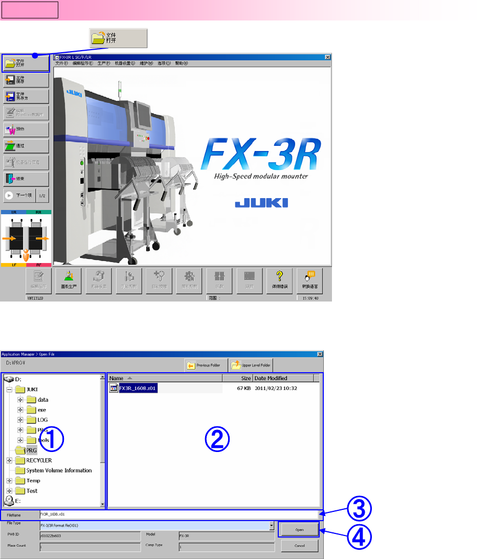 操作手册 I 2-4 ① 选择命令按钮 。 ② 显示打开文件的画面。请选择生产程序。 <步骤> ① 选择文件夹。 ② 选择文件。 ③ 确认文件名。 ④ 选择「打开」 。 Step3 读入生产程序