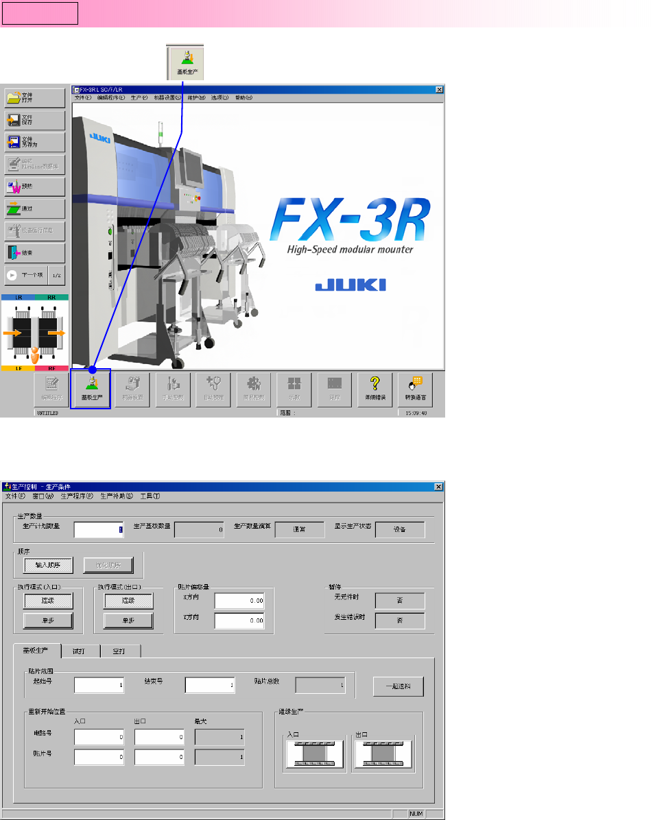 操作手册 I 2-7 FX-3R 可以使用「支援准备」功能,边确认步骤,边进行生产准备。 用户等级为「管理人」以上时,可以进入支援程序的项目。 请按照步骤,设置各个项目。 ① 请从生产画面的菜单栏选择「生产补助」/「支援准备」 。 ② 显示「支援准备」画面。 请依次执行 1 ~ 8 的项目。 Step5 进行生产准备(支援准备) 按下按钮后, 显示各个单元的操 作画面。 贴片头部分妨碍作业时, 要 让 贴片头 退 避 。 完成作业后,显…