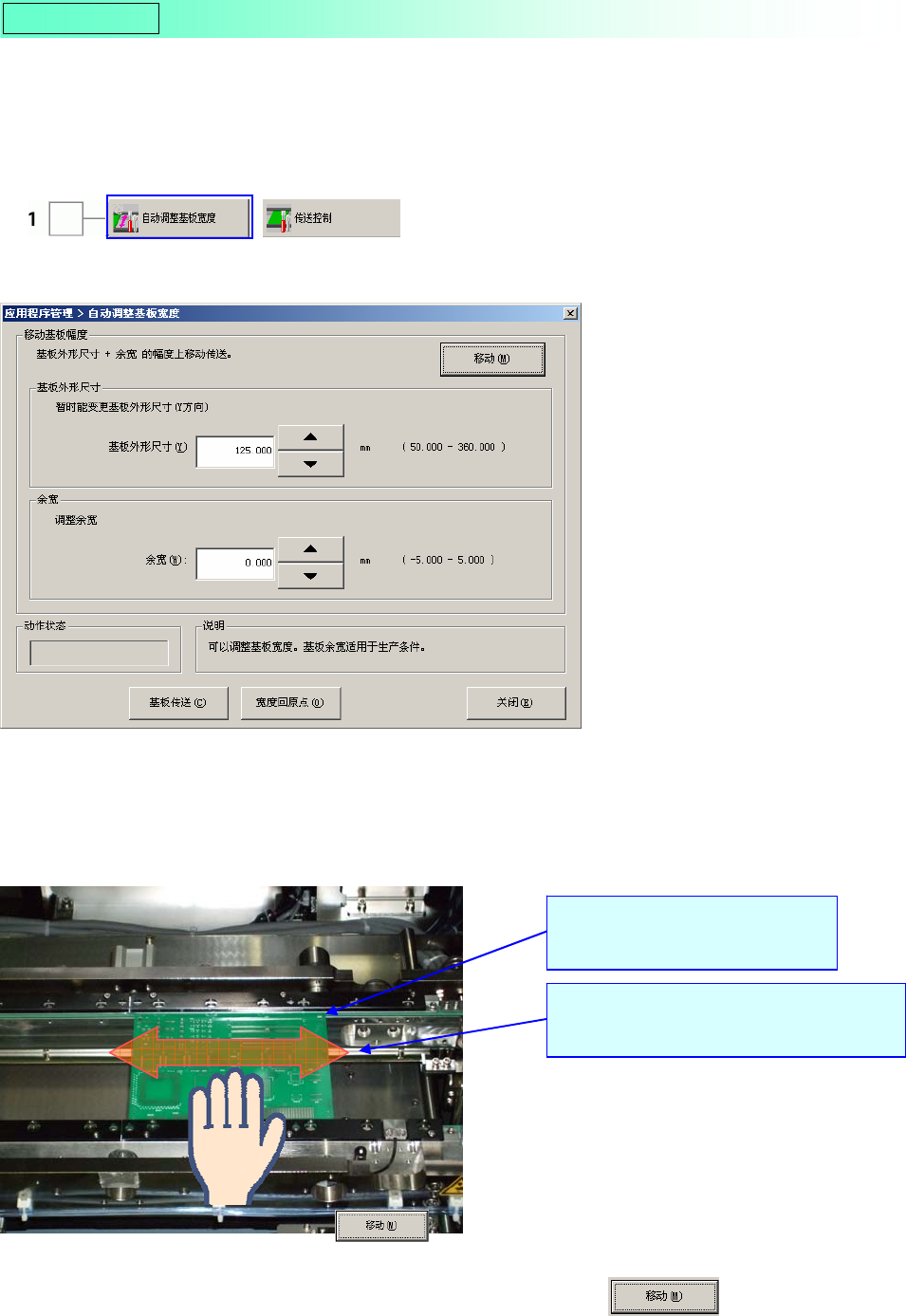 操作手册 I 2-8 调整传送部分,使得基板传送顺畅。 <步骤 1 > 设置传送轨道宽度 ※ 已在 S tep3. 更改过传送宽度时,只进行确认及微调整即可。 ① 请按下「自动调整基板宽度」 。 ② 显示「自动调整基板宽度」画面。 ③ 确认设置的尺寸后,请按下按钮。 (要执行「移动」 、而尚未执行「宽度回原点」时,请按提示,先执行返回原点。 ) ④ 把基板放在传送带上,确认轨道宽度。 ⑤ 传送轨道宽度太宽、或太窄时,请调整「余宽」后,再…