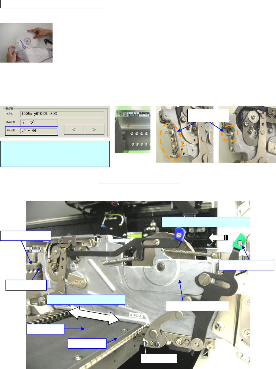 例)把安装有元件名“1005c-y01022bs603”元件的带状送料器,安装在左前的送料器台架 44 号上。