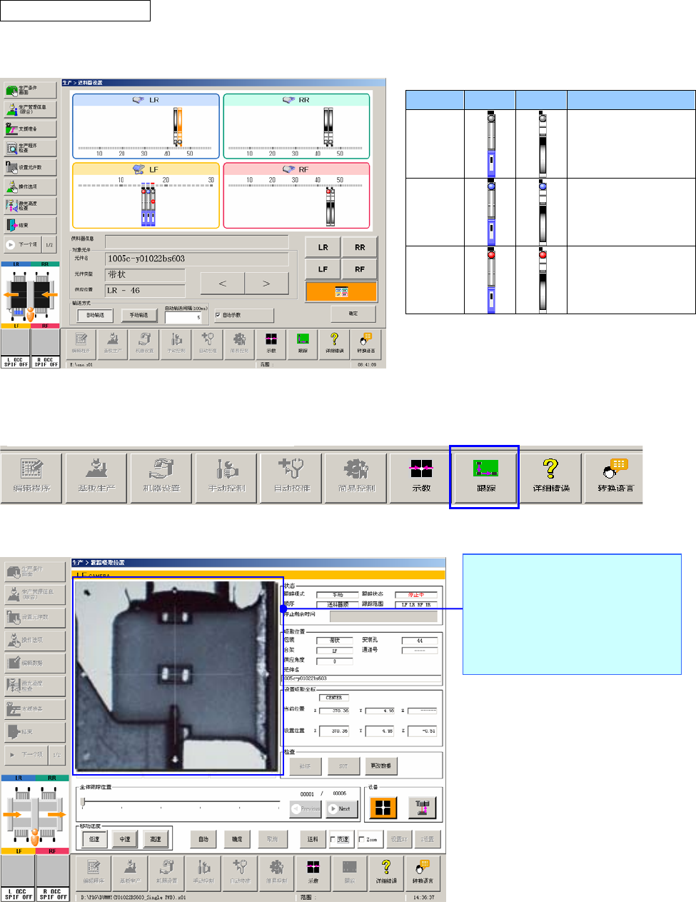 操作手册 I 2-23 ・ 机械式/电动式共通 执行吸取位置摄像机跟踪 ① 在「送料器设置」画面上设置各个项目。 ② 请按下画面下方的「功能栏」/「跟踪」 。 ③ 显示「跟踪吸取位置」画面。 色 电动 机械 说明 灰色 未执行示教的供料 器。 蓝色 示教正常完成的供 料器。 红色 示教失败的供料器。 跟踪方法为「手动传送」时, 可以触摸叠加画面, 进行示教。 (有些类型的元件可以自动示 教。 )