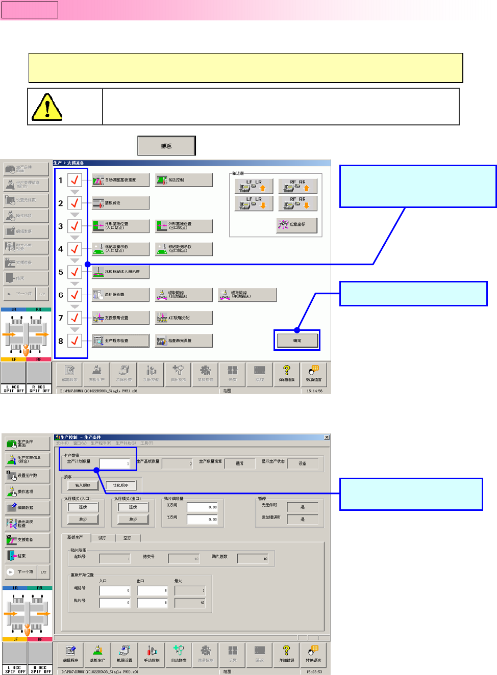 操作手册 I 2-30 在“基板生产”画面上设置“生产计划数量” ,按下 [ 开始开关 ] 后,即开始生产。 ① 请点击「支援准备」的 按 钮 。 ② 输入生产计划数量。 注意 按下[开始开关]后,装置即开始移 动。 为避免伤害人身,请绝 对不要把手或头部等伸入装置内 部。 Step6 执行生产 输入「生产计划数量」 。 点击「确定」按钮。 执行「支援准备」的各项作业 后,显示勾号。 ※关于生产画面的详细说明请参见『操作手册Ⅱ』的“ 3…