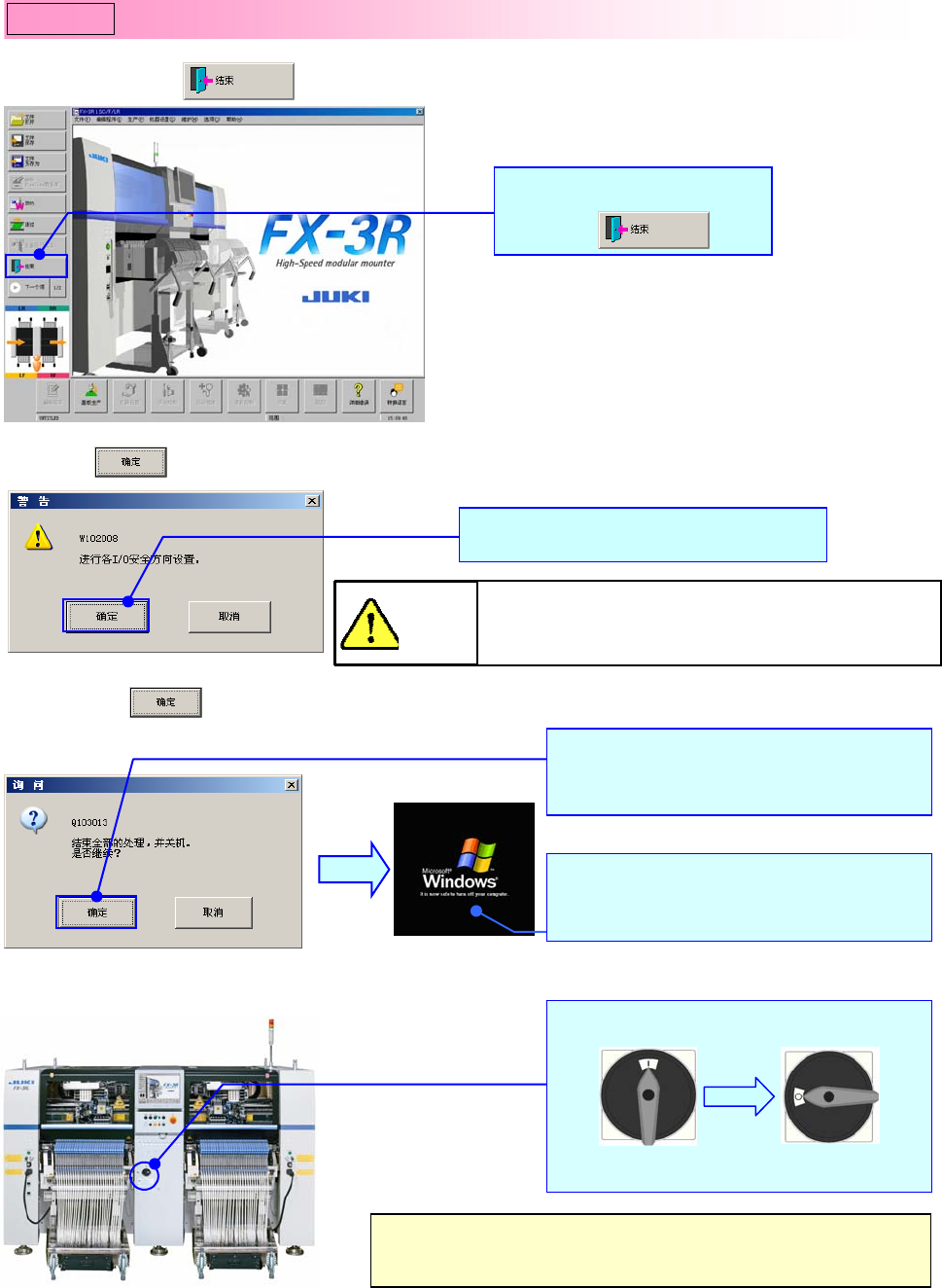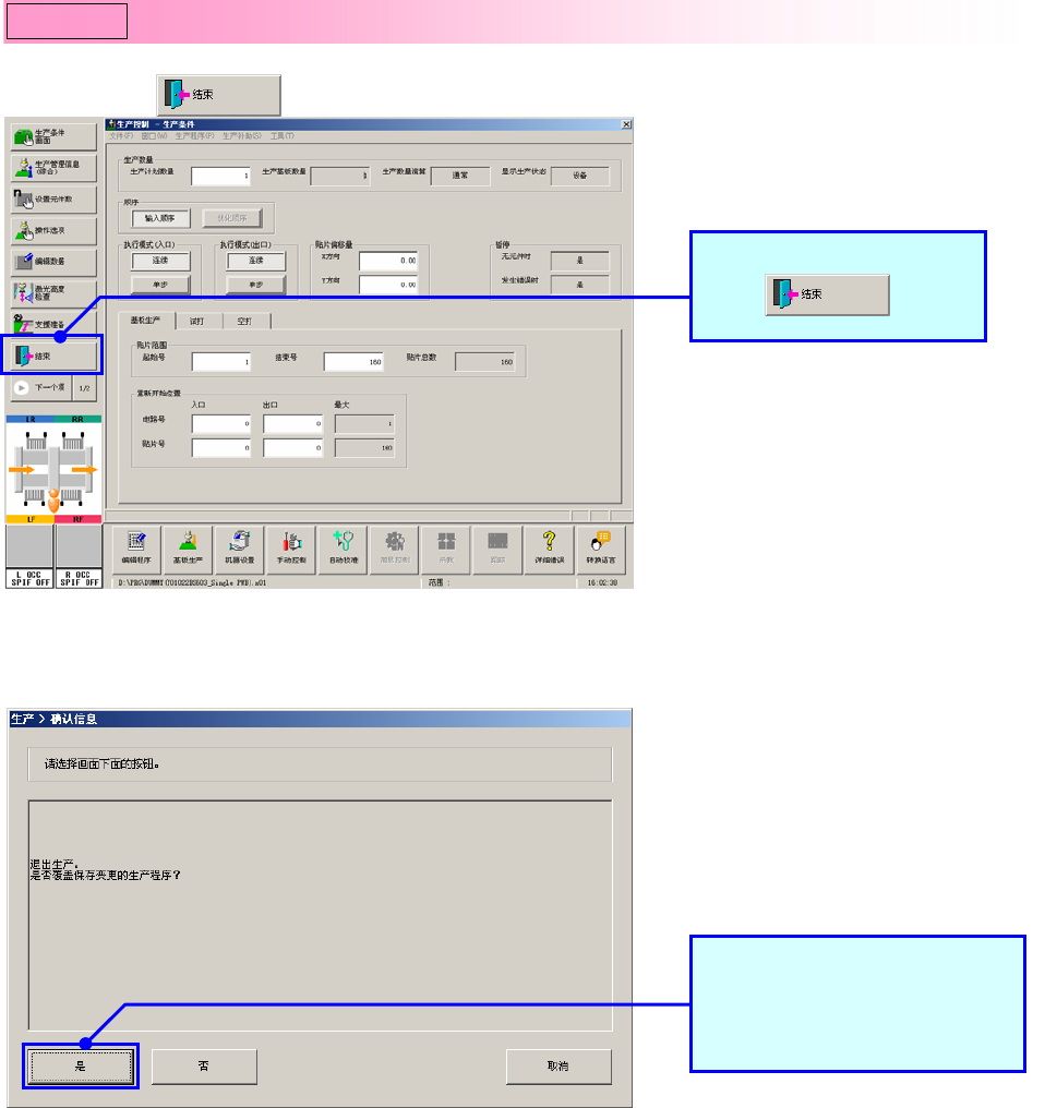 操作手册 I 2-32 ① 按下按钮 。 ② 没有保存生产程序时,会显示「确认信息」画面。 从命令按钮中选择 按钮 。 Step7 结束生产画面 选择「是」后,生产中变更的 程序和生产管理信息即可保存 下来。