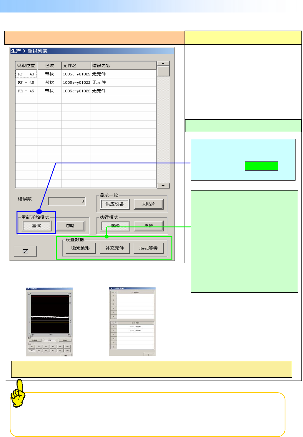 操作手册 I 3-2 错误的原因,原因 出现无元件时,显示下列画面,装置进入暂停。 处理错误的方法 ①无元件。 ②元件吸取错误。 (送料带剥离堵塞、 传送不畅等造 成的吸取位置偏离等) ③元件吸取超次。 无元件暂停时, 按下按钮「功能栏」 / 「示教」后, 可以再确认无元件的吸取位置。 发 现偏移大时,请再进行示教。 补充完元件, 或将错误的原因 (卷 带堵塞等)排除·处理 完后,选 择「重试」 ,按下 开始开关 。 发生错误的画 面 …