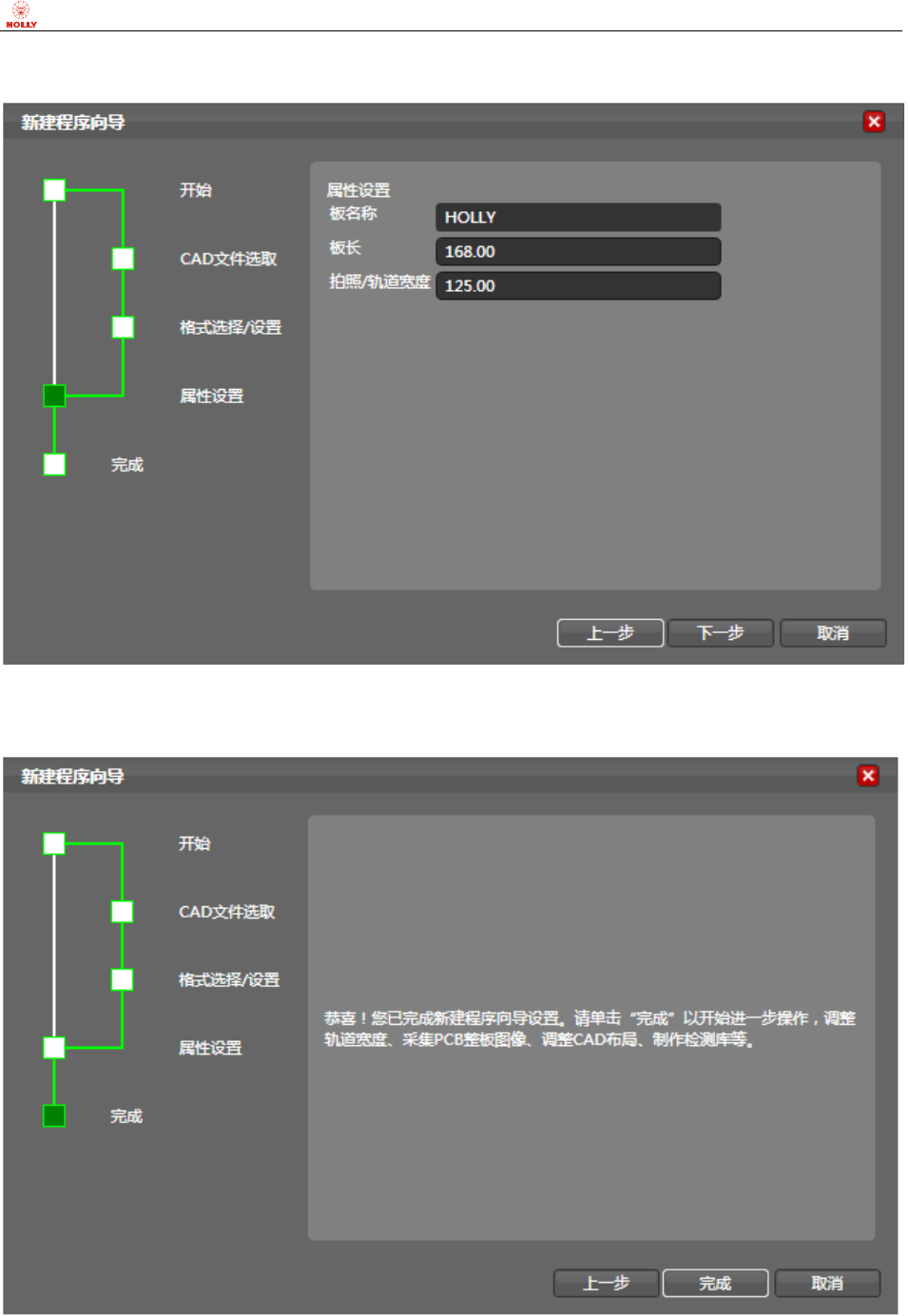 上海赫立电 子科技有 限公司 在线型自动 光学检测 仪使用手 册 第 17 页 共 64 页 步骤 6 ): 屏 幕返回 到 “新建程序 向导” 对 话框, 点击 “下一 步” , 对所测 PCB 的属性 (长度、 宽度 及板 厚尺寸)进 行设置, 完成设置 后 点击 “下一步” 按钮 ; 恭喜 !您 已完成 CAD 数据的导 入。屏幕 出现进一 步的操作 步骤提示 ,点击“ 完成”按 钮;