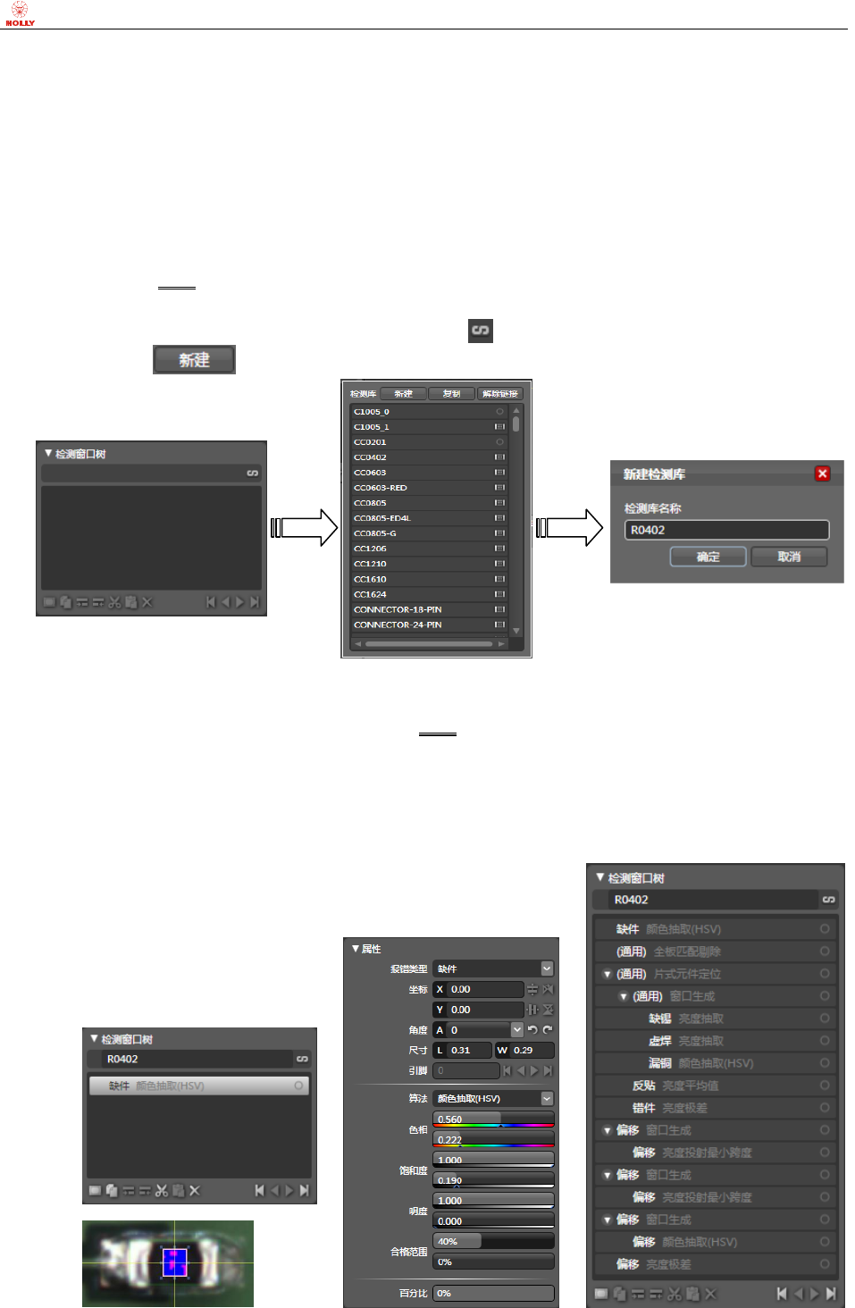 目录,“赫立 AOI 系统软件”将切换成检测库编辑界面,在“检测窗口树”板块点击右侧的“检测库新