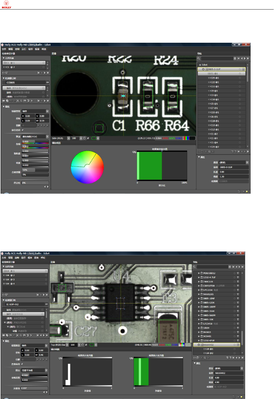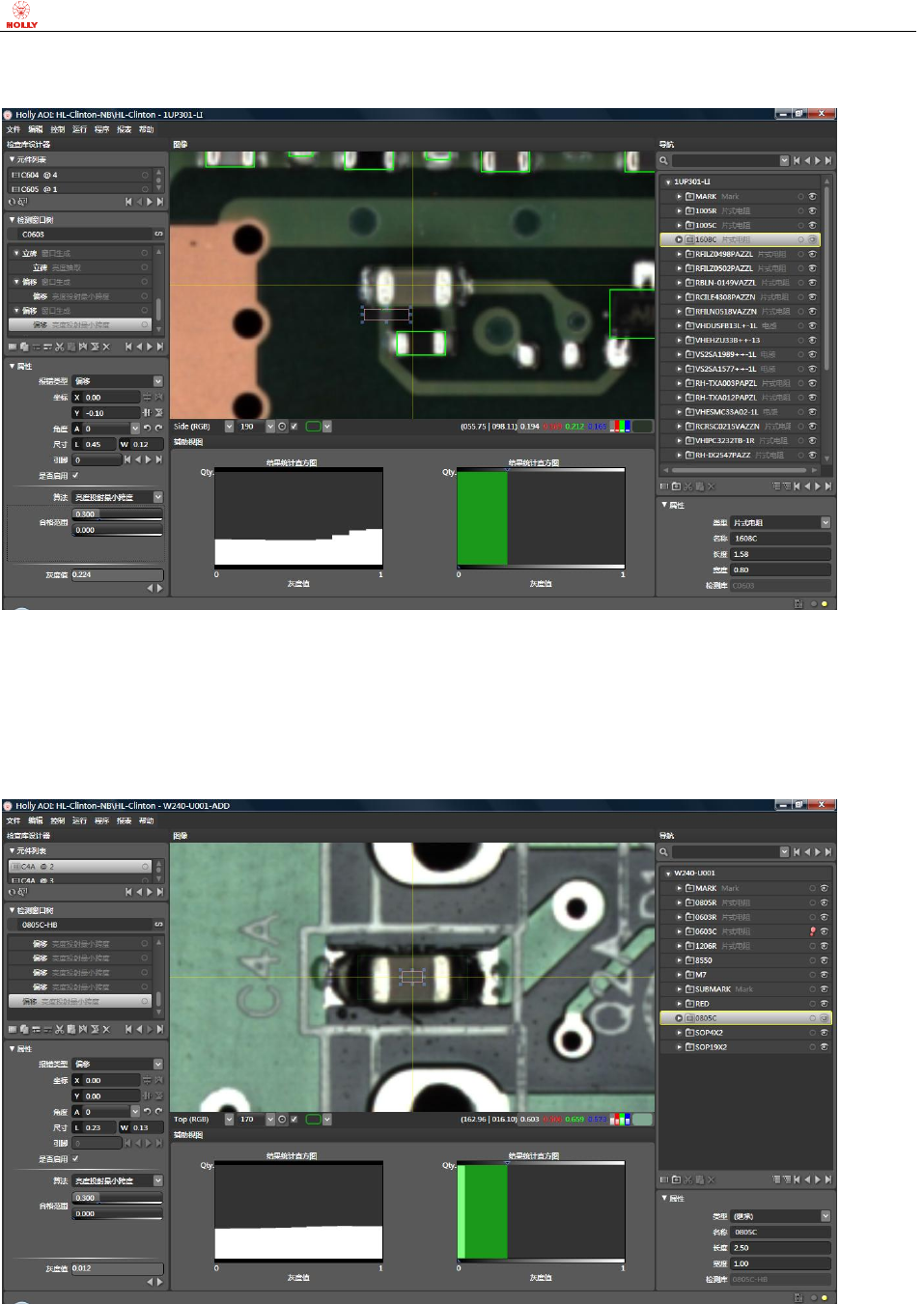上海赫立电 子科技有 限公司 在线型自动 光学检测 仪使用手 册 第 51 页 共 64 页 c) 缺件检测方法 之 亮度最大值 在 Side (RGB) 真彩 色图像模 式下: 当 二极管 D1 未缺 件时, 本体相对 较暗, 亮度最大 值相对较小 ; 当元 件缺件时, 元件本体 下的白色 高亮 丝印便 裸露 出来,亮度最 大值 则相对较 大。 d) 缺件检测方法 之 亮度投射最小跨 度 在 T op (RG B) Dar k 图像模…