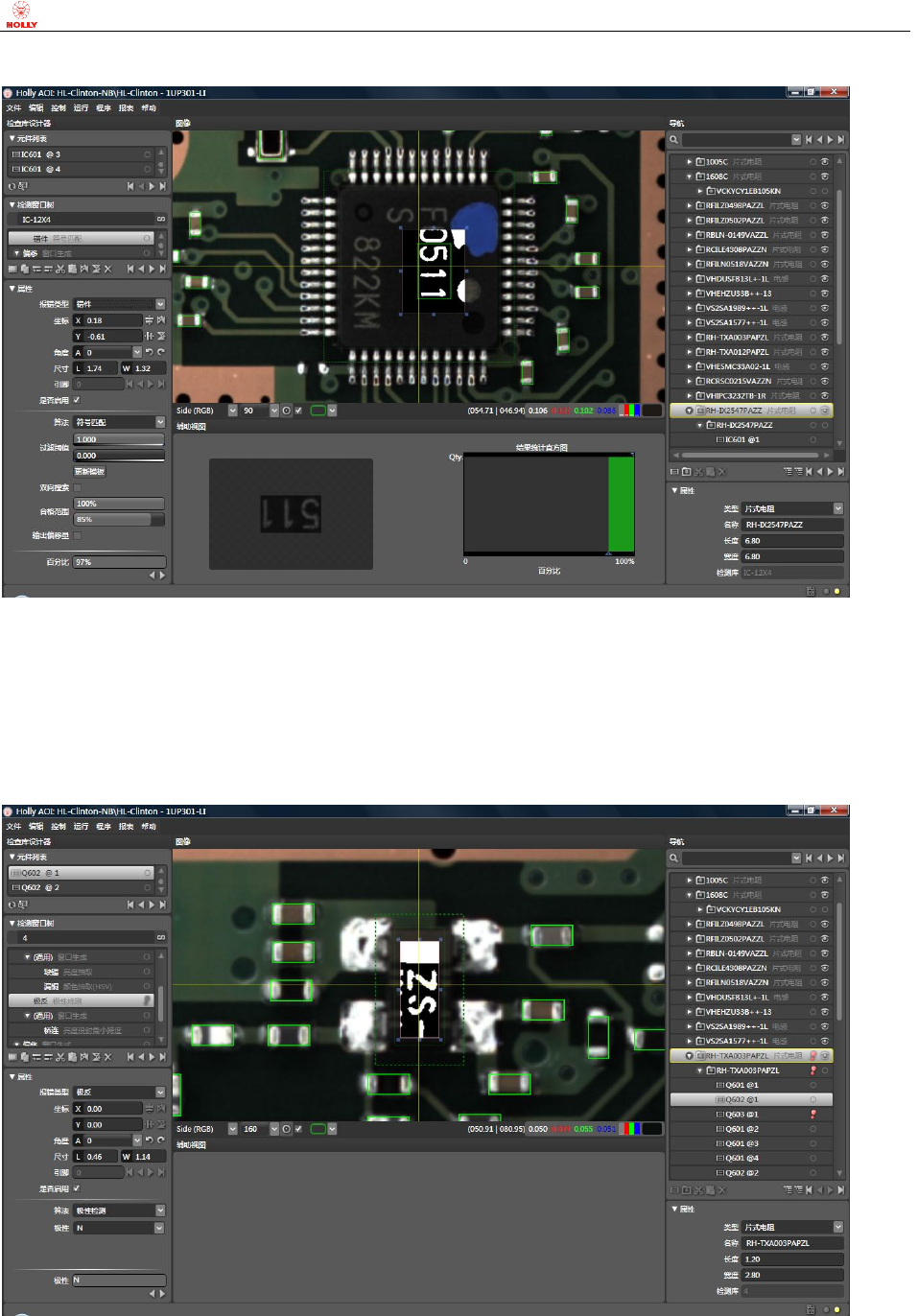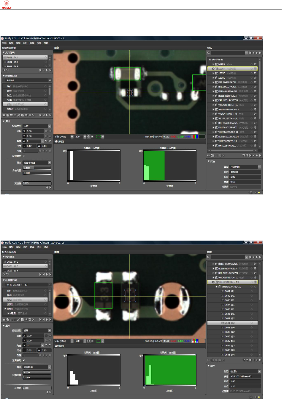 上海赫立电 子科技有 限公司 在线型自动 光学检测 仪使用手 册 第 58 页 共 64 页 5-4-6. 错件 a) 错件检测方法 之 亮度 抽取 在 Side ( RGB ) 真 彩色图像 模式下 : 电 容元件未错 贴成 电阻元件 时, 本体表 面亮度均 匀且很亮 , 当前检 测窗口位置 亮度很暗 的像 素数占窗 口内像素 总数的比例 非常少 ; 而当元 件错贴成 电阻 元件时, 电阻元件 本体较暗, 导致亮度 抽取 亮度很暗 的…