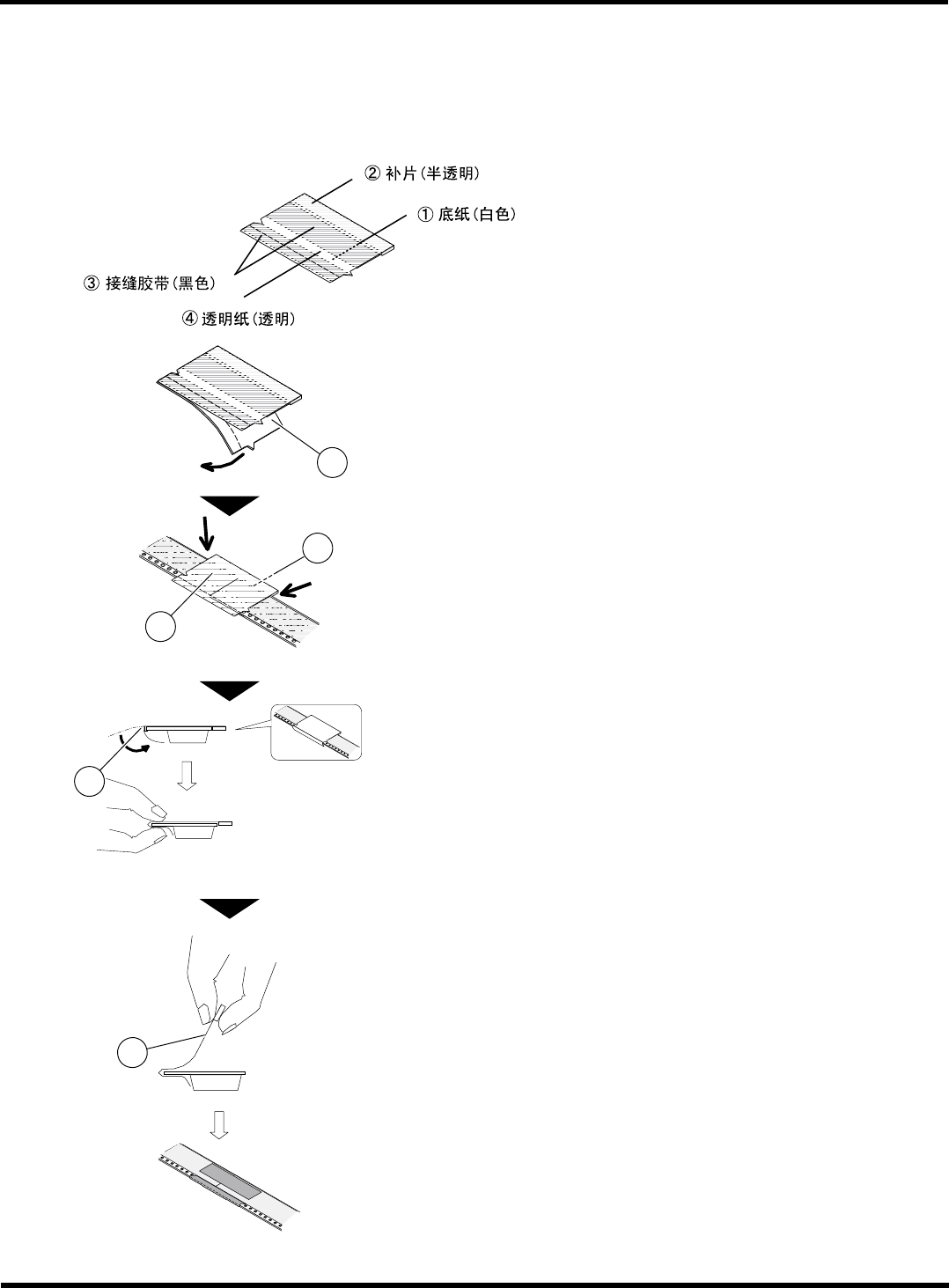 Tape S plicing 操作手册 2.2 12 ~ 72 m m 宽编带 ( 用敛缝治具连接 ) Page 2-16 2. 24 ~ 72 mm 宽编带 各部分的名称 1. 剥离底纸 。 2. 将接缝胶带 置于载体编带宽 的中间并粘贴 于压紧胶带的表面。 ∗ 请将 56 m m 、 72 m m 宽编带垂直于编带的侧向粘贴 接缝胶带。 3. 剥离透明纸 。 ( 完成图 ) T ASP-077C T ASP-08…
