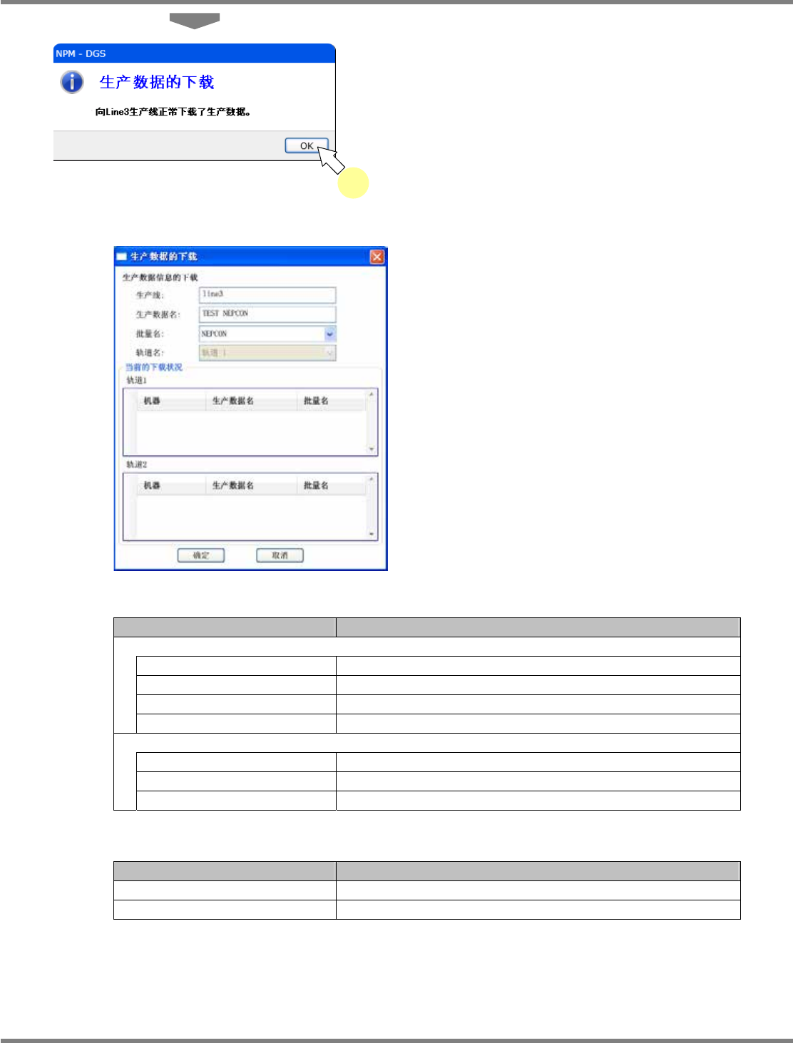 NPM-DGS 程序手册 9.3 生产数据的操作 EJS9AC-MB-09P-06 Page 9-31 9.3.4 生产数据的下载 下载生产数据。 1 从生产数据管理一览中, 选择需要下载 的数据。 2 选择菜单栏的 [ 文件 ] [ 生产数据的下 载 ] ,或者点击工具栏的 。 显示 < 生产数据的下载 > 画面。 3 选择需要下载到设备上的批量和轨道。 在指定轨道时,或者在单轨的情形下 ,不能选 择轨道。 4…