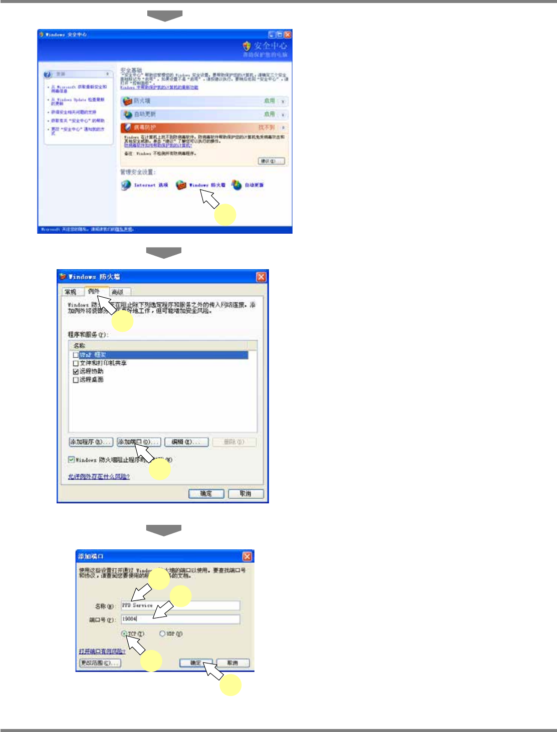 NPM-DGS 程序手册 2.1 NPM-DGS 的安装 EJS9AC-MB-02P-03 Page 2-57 3 点击 [Windows 防火墙 ] 。 4 点击 [ 例外 ] 标签。 5 点击 [ 添加端口 ] 。 6 在 ‘ 名称 ’ 栏中输入任意的文字。 ( 例 :PPD service) 7 在 ‘ 端口号 ’ 中输入 ‘19884’ 。 8 选择 [TCP] 。 9 点击 [ 确定 ] 。 Other020402S- 03C…
