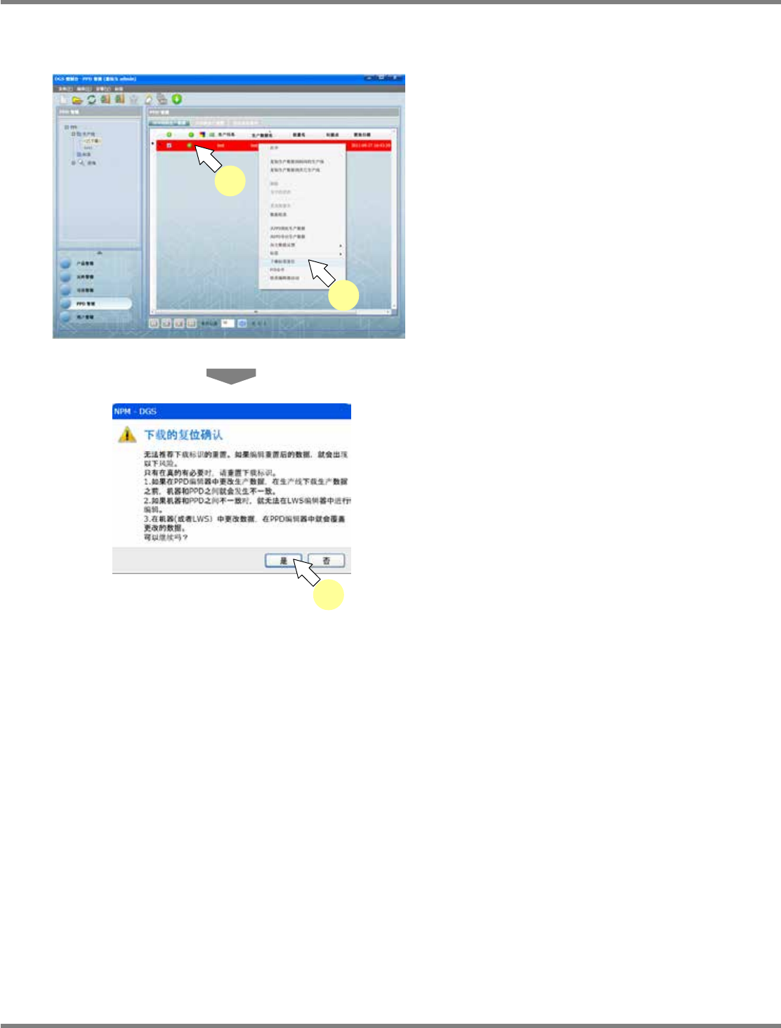 NPM-DGS 程序手册 9.3 生产数据的操作 EJS9AC-MB-09P-06 Page 9-39 9.3.8 下载标志的复位 1 选择用红色显示的生产数据。 2 选择右击菜单的 [ 下载标签复位 ] 。 显示出 下载的复位确认 画面。 3 点击 [ 是 ] 。 强制解除所选择的生产数据的下载状 态。 需要复位生产中数据的下载图标, 执行编辑后, 再以相同的名称再次下载时,需要线 性下载。 ( 以防缺欠 ) 需要…