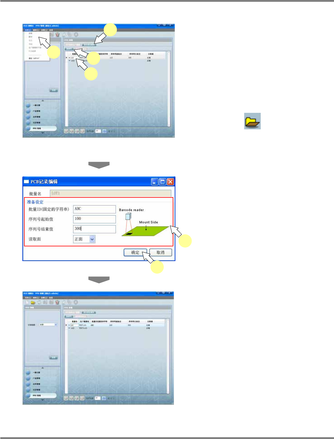 NPM-DGS 程序手册 9.3 生产数据的操作 EJS9AC-MB-09P-06 Page 9-47 条形码信息的编辑 1 点击 [ 自动准备替换 ] 标签。 2 点击 [ 条形码 ] 标签。 3 从一览表中选择编辑 PCB 代码的生产 数据。 4 选择菜单栏的 [ 文件 ] [ 打开 ] ,或者点 击工具栏的 ( 打开 ) , 或者在右击 菜单中选择 [ 打开 ] 。 显示出 <PCB 记录编辑 > 画面。 …