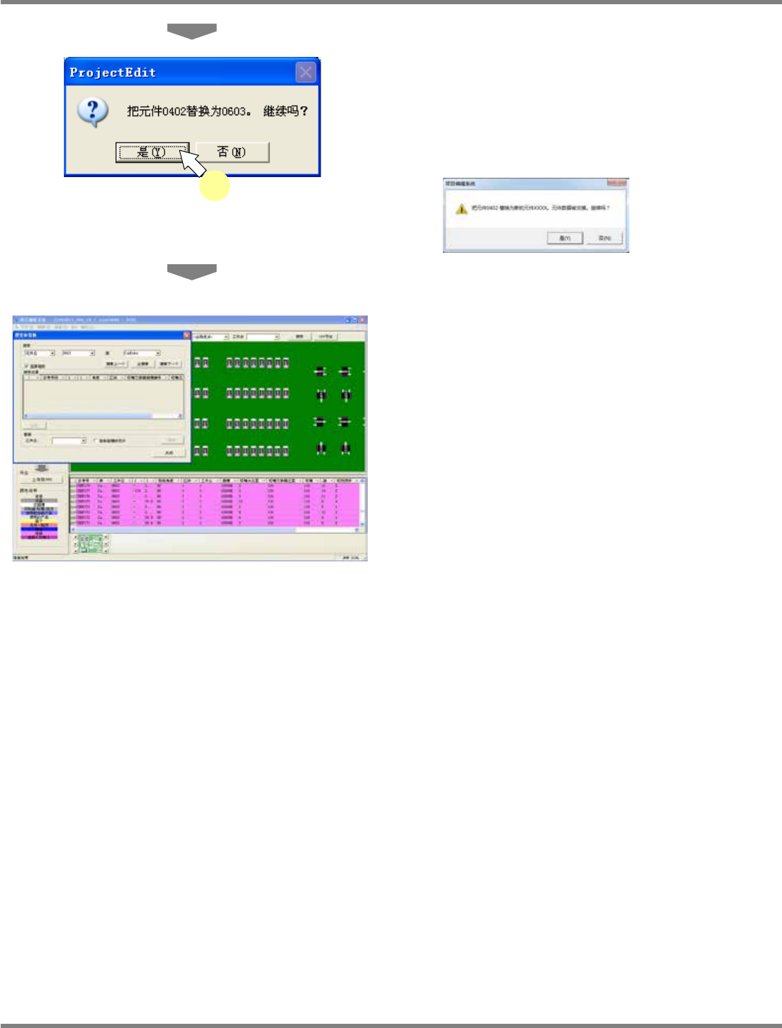 NPM-DGS 程序手册 9.4 关于项目编辑系统画面 Page 9-98 EJS9AC-MB-09P-06 5 点击 [ 是 ] 。 当选择了所选元件库内的元件时,将 显示左侧 画面。 输入元件名后替换时,将显示下述画 面。 将会在基板信息上显示替换后的元件 。 PPD090505S-08C 02 PPD090505S-09C 00 5 PPD090505S-10C 00