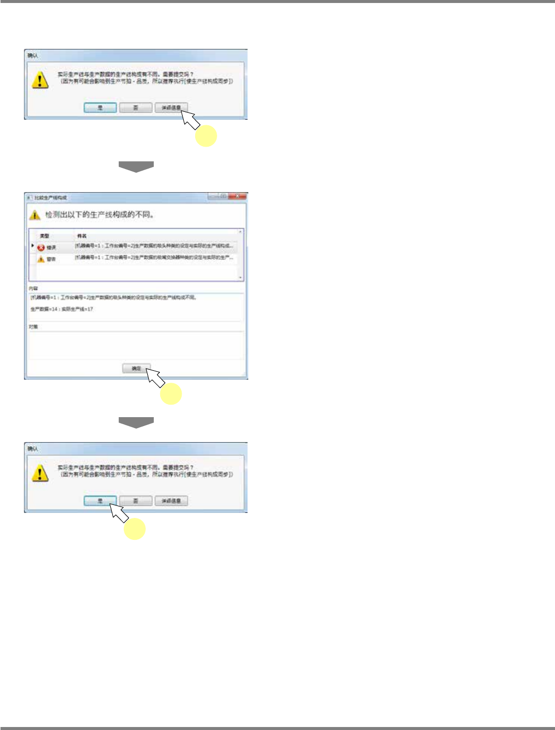当实际生产线与生产数据的生产线构成存在不同时,将显示确认画面。