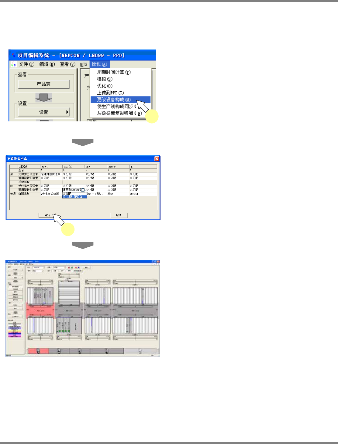 NPM-DGS 程序手册 9.6 生成数据 Page 9-110 EJS9AC-MB-09P-06 9.6.5 更改设备构成 可更改生产数据内的设备构成。 在 PPD 编辑器上,可进行元件排出传送 带、转写单元、轨道类型的变更。 1 选择菜单栏的 [ 操作 ] [ 更改设备构 成 ] 。 显示出 < 更改设备构成 > 画面。 2 更改设备构成。 在 PPD 编辑器下,只有在设备为 NPM 时可进 行更改。 手…