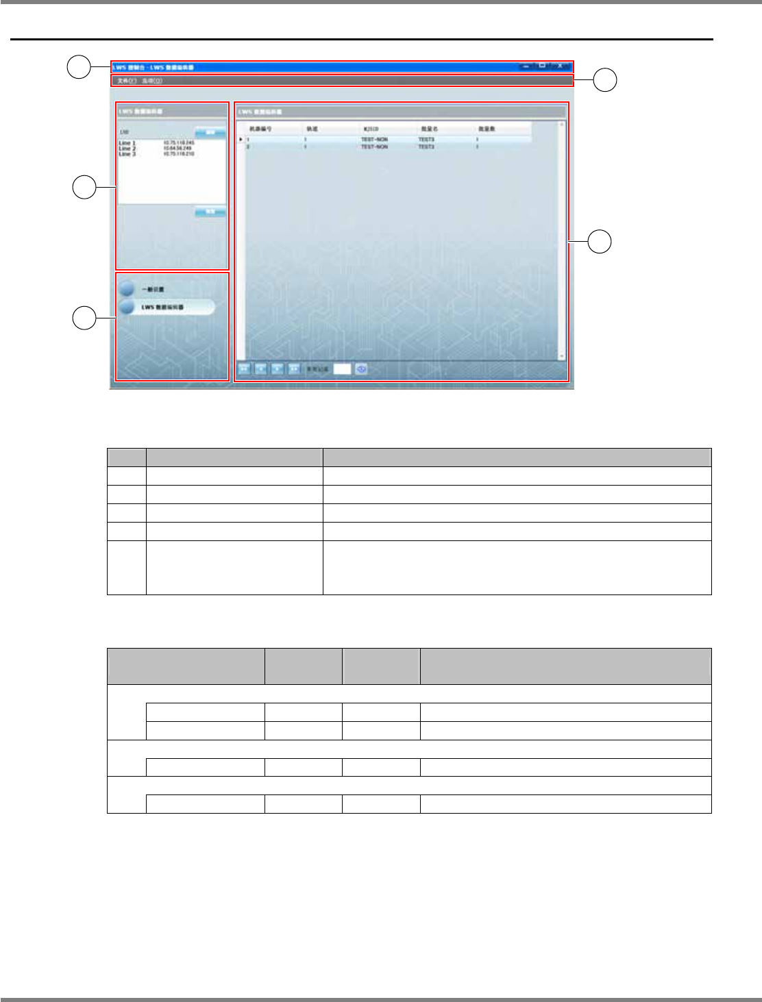 NPM-DGS 程序手册 10.3 关于 LWS 数据编辑器画面 Page 10-6 EJS9AC-MB-10P-04 10.3 关于 LWS 数据编辑器画面 No. 名称 说明 标题栏 显示版本信息、注册用户名、使用中 的应用程序软件名。 菜单栏 显示文件、选项、帮助的菜单栏。 导航区域 显示连接中的 LNB 。 应用程序软件快速启动栏 切换 < 环境设定 > 画面和 <LWS 数据编辑器 &…