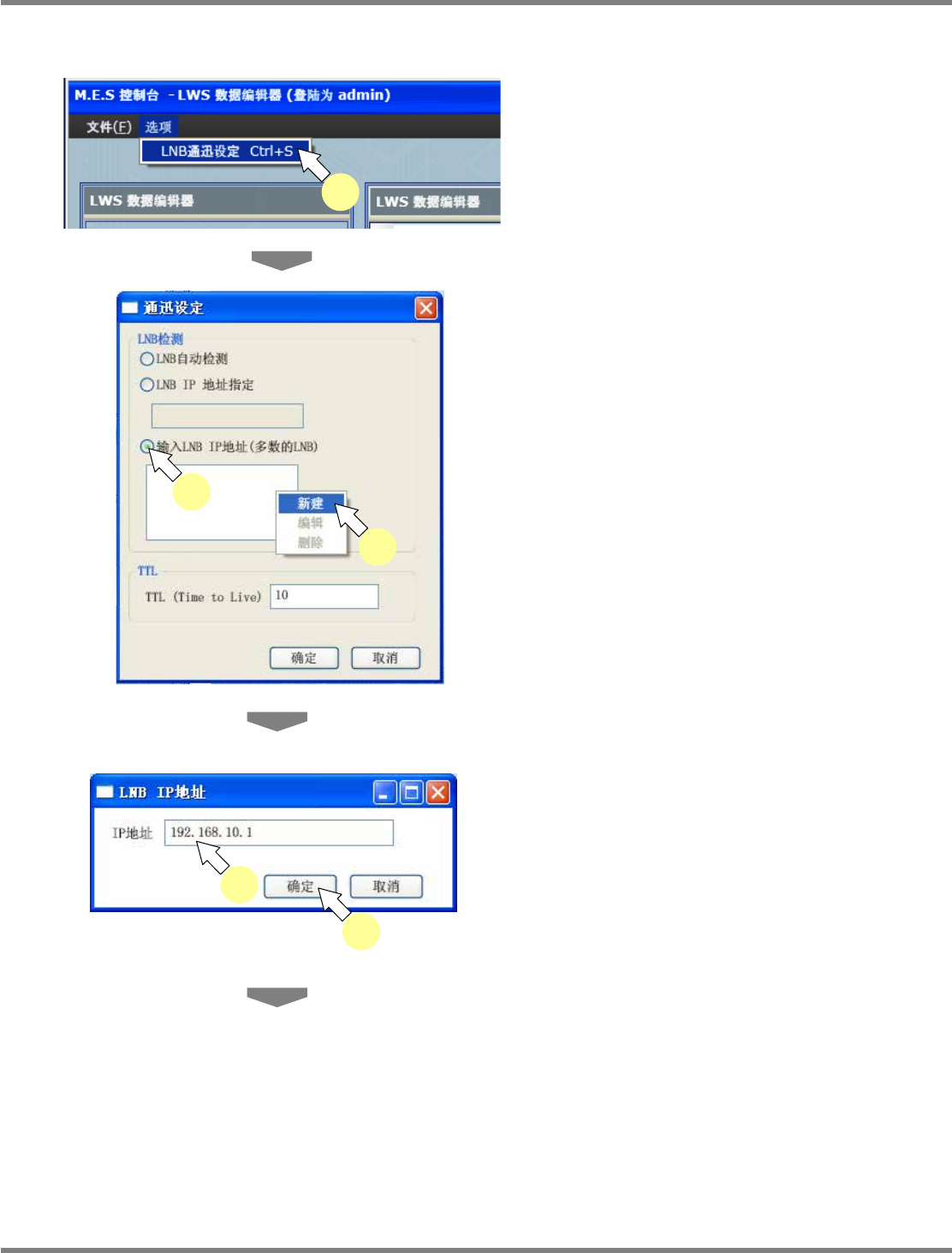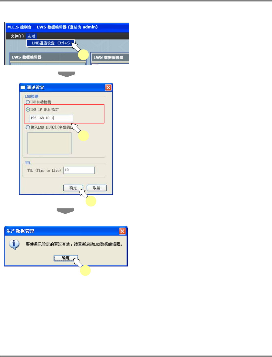 NPM-DGS 程序手册 10.3 关于 LWS 数据编辑器画面 Page 10-10 EJS9AC-MB-10P-04 指定 LNB IP 地址 1 点击菜单栏的 [ 选项 ] [LNB 通讯设 定 ] 。 显示出 通讯设定 画面。 2 选择 [LNB IP 地址指定 ] 后,输入对象 LNB 的 IP 地址。 3 点击 [ 确定 ] 。 结束 通讯设定 画面。 4 点击 [ 确定 ] ,重新启动 LW…